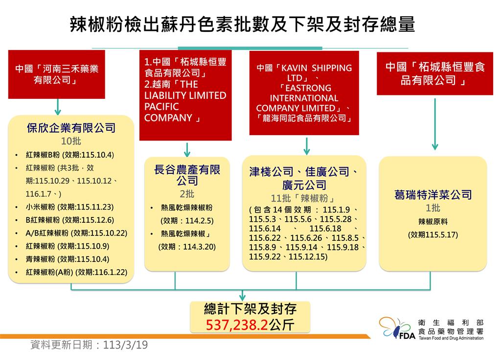 至2024年3月20日食藥署統計全台已下架封存蘇丹紅問題辣椒粉共537,238.2公斤,已查出有4間業者輸入問題辣椒原料,輸入源頭來自中國和越南。食藥署呼籲食品業者應落實自主管理,同時也持續追查不合格產品。