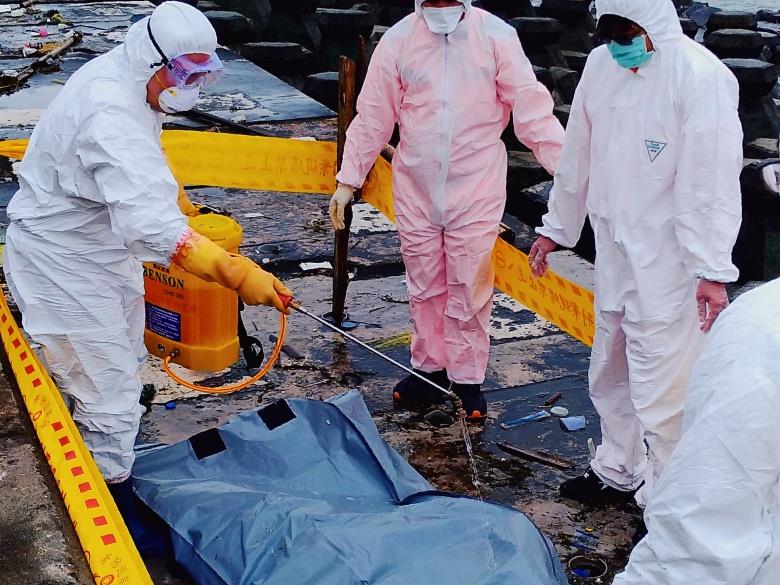 2019年4月4日連江縣南竿清水沃岸際發現1頭漂流上岸的死亡豬隻,檢出非洲豬瘟病毒核酸陽性。依地理位置研判,該頭豬隻應自中國漂流過來。(圖片來源:中央應變中心提供)