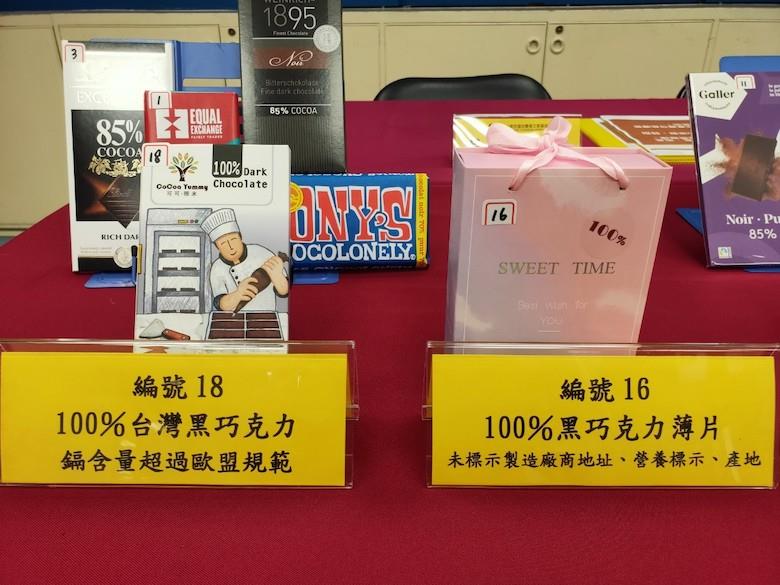檢驗結果發現,在鎘含量方面,檢驗的20件商品中都有驗出鎘,而「100%台灣黑巧克力」含量超過0.8mg/kg,高於歐盟規範。