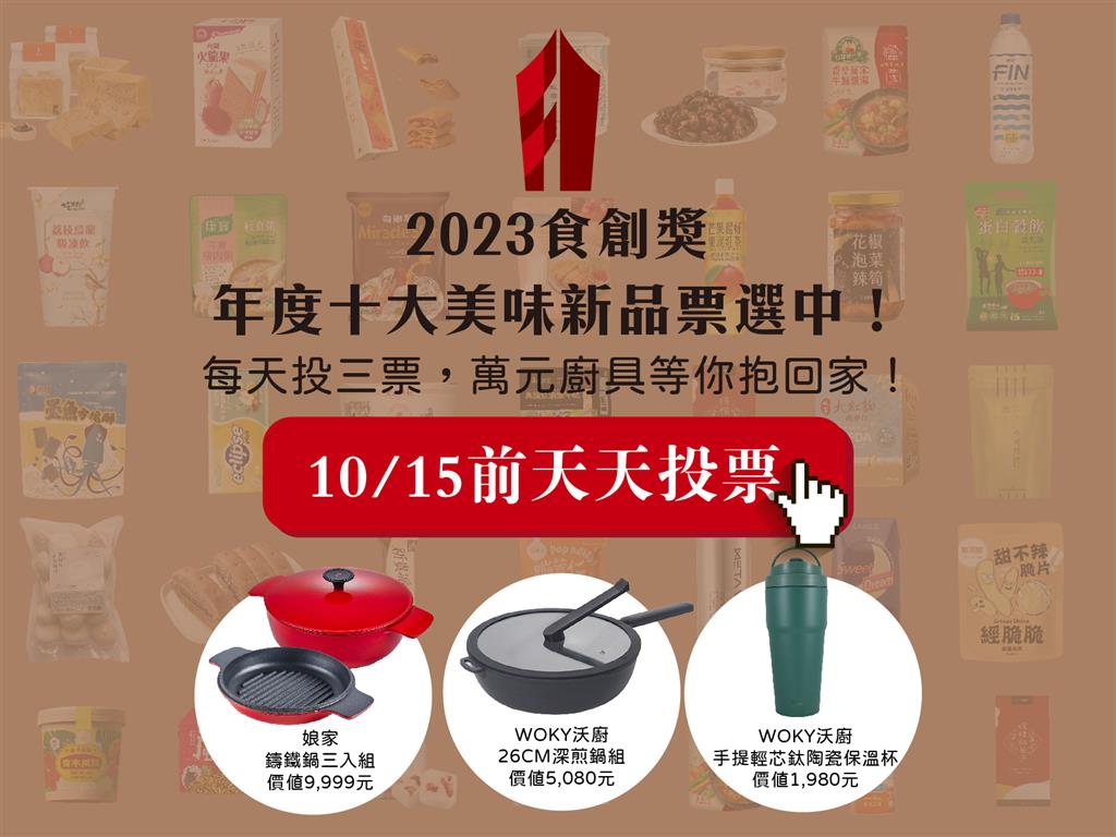 有「台灣飲食產業奧斯卡獎」之稱的「2023食創獎」,2023年8月21日至10月15日「年度創新美味新品」投票,已進入最後倒數階段!只要登入會員天天都能投票,而且投越多中獎機率越高,就有機會獲得將高級鍋具!