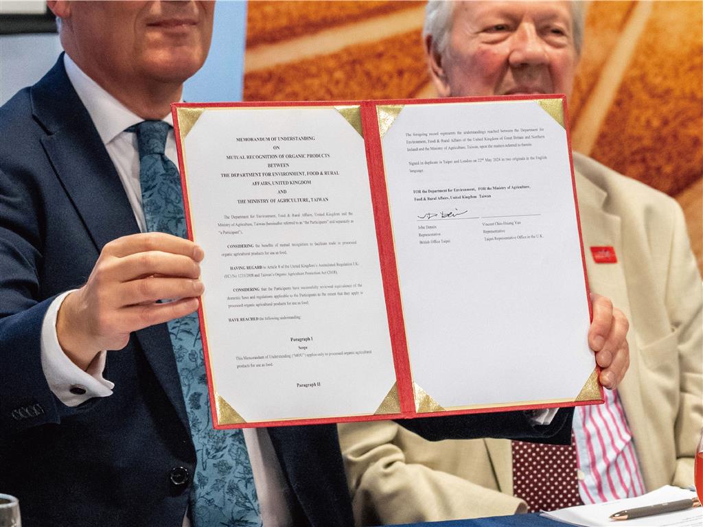 農業部與英國環境、食品與鄉村事務部(DEFRA)歷時逾2年之有機法規比對及諮商作業後,達成雙邊有機同等性共識,2024年5月22日在英國貿易特使福克納勛爵(Lord Faulkner)及雙方主管機關代表共同見證下,由我國駐英國台北代表處姚金祥代表與英國在台辦事處鄧元翰(John Dennis)代表簽署臺英有機產品相互承認瞭解備忘錄,完成有機同等性相互承認。