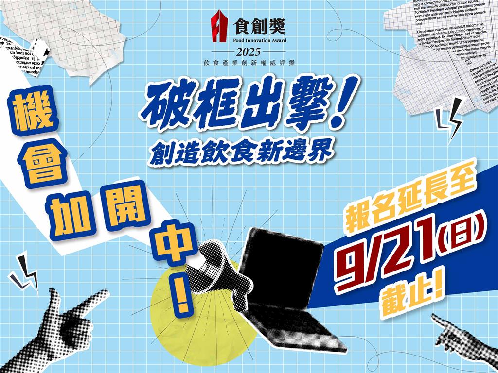 2025年「食創獎」以「破框出擊!創造飲食新邊界」為主題,廣邀產業與校園創新行動者,橫跨多項領域,從食品研發、包裝設計、行銷策略、產業服務與飲食教育,共同開創飲食產業的未來版圖。報名機會加開、徵件至2025年9月21日為止,把握機會趕快報名。
