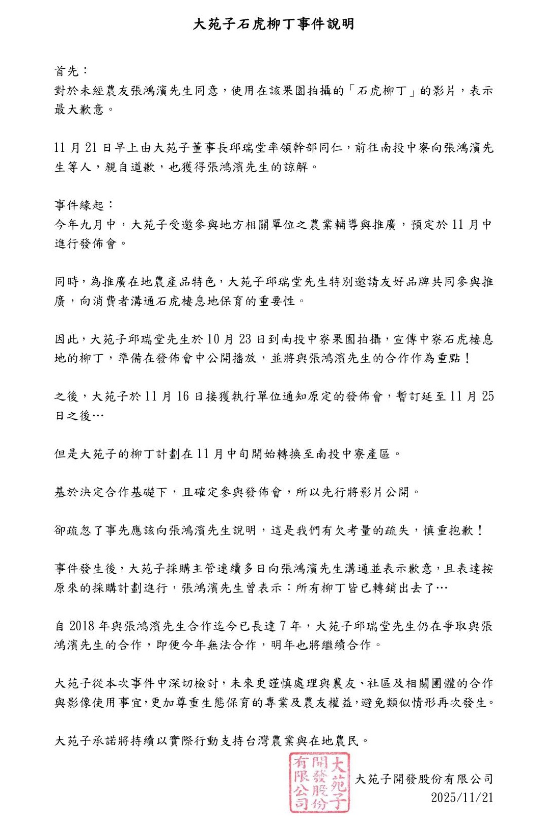 大苑子「石虎柳丁」宣稱引發的爭議持續延燒。2025年11月21日大苑子發布最新聲明,承認在影片拍攝與資訊溝通上確有不足,並由董事長邱瑞堂率領幹部同仁,前往南投中寮向南投中寮長壽天然農場主人張鴻濱親自致歉。這也是事件爆發後,大苑子第二度公開說明並且正式道歉,顯示品牌開始正面回應外界對其永續敘事與採購透明度的質疑。