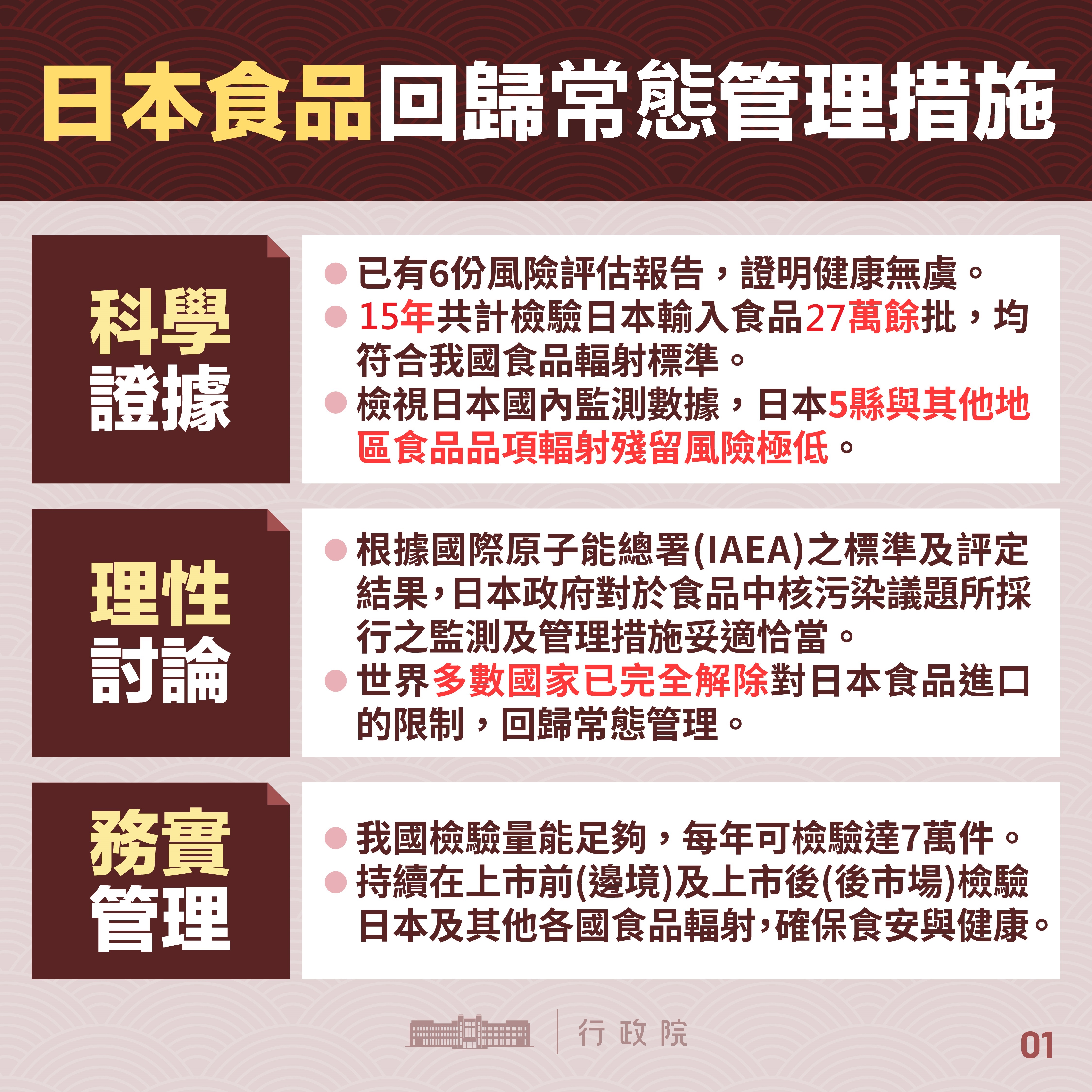 行政院指出,考量風險證據充分、監測數據透明且連續15年無異常,加上科學證據充分、評估透明,政府將依「科學證據」與「風險分級管理」原則,研議將日本食品由特別管制逐步回歸源頭管理與邊境常態抽驗。此措施在預告期間未收到反對意見,故將日本食品管理調整為與其他國家一致,採取以風險分級為基礎的抽驗機制,維持邊境前後的嚴謹把關。