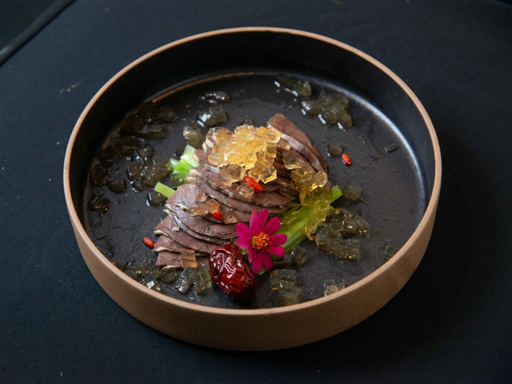 海峽會廚藝總監方永銘嚴選御牧牛品牌的牛腱肉,經過特製陳皮老滷汁的8小時浸泡,使肉質軟嫩入味、香氣滲透其中。經油炸後裹上醬汁,撒上花生碎、芝麻及辣椒渣,口味層層堆疊,辣香中帶著陳皮的獨特餘韻。(圖片來源:艾佳國際貿易有限公司提供)