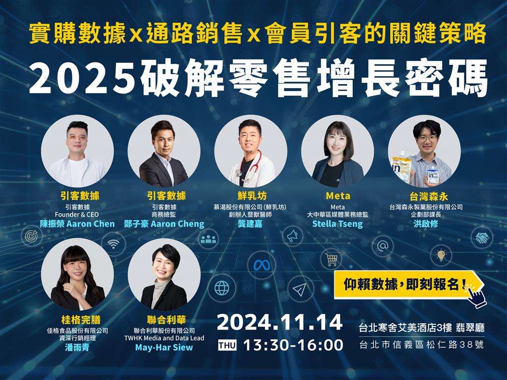 2025年11月14日,零售業精英將齊聚台北寒舍艾美酒店,共同參與「2025破解零售增長密碼」論壇。本次論壇針對快消品品牌面臨的數據決策需求與高廣告成本挑戰,深入探討如何運用實購數據、通路銷售與會員經營來吸引新客、增強顧客忠誠度。專家講者將展示數據分析在行銷優化、產品開發等領域的實際應用,協助品牌建立市場競爭優勢。論壇現場免費參與,歡迎提前報名。