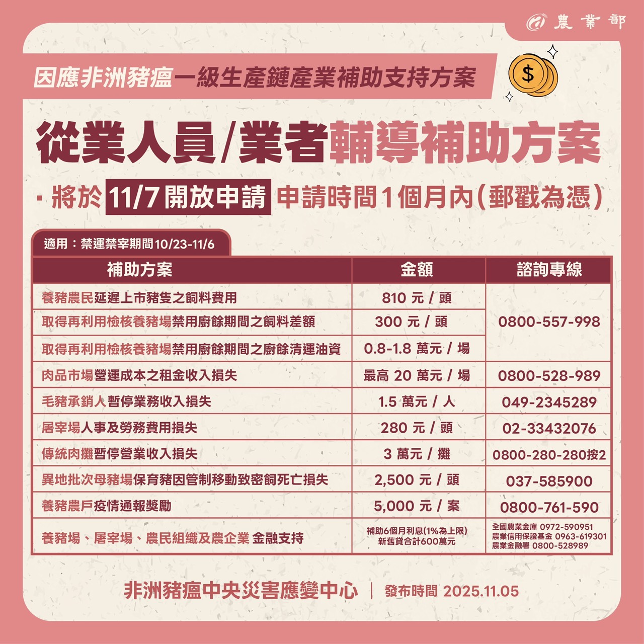 為協助受禁令影響的豬農與業者,農業部將提供飼料差額補助,並啟動「一級生產鏈產業補助支持方案」,補助對象涵蓋養豬農民、肉品市場、毛豬承銷人、屠宰場、傳統肉攤、異地批次母豬場及疫情獎勵通報等。該方案將自11月7日起開放申請,業者可透過各地方政府或撥打養豬產業服務專線0800-528-989洽詢,由專人提供協助。