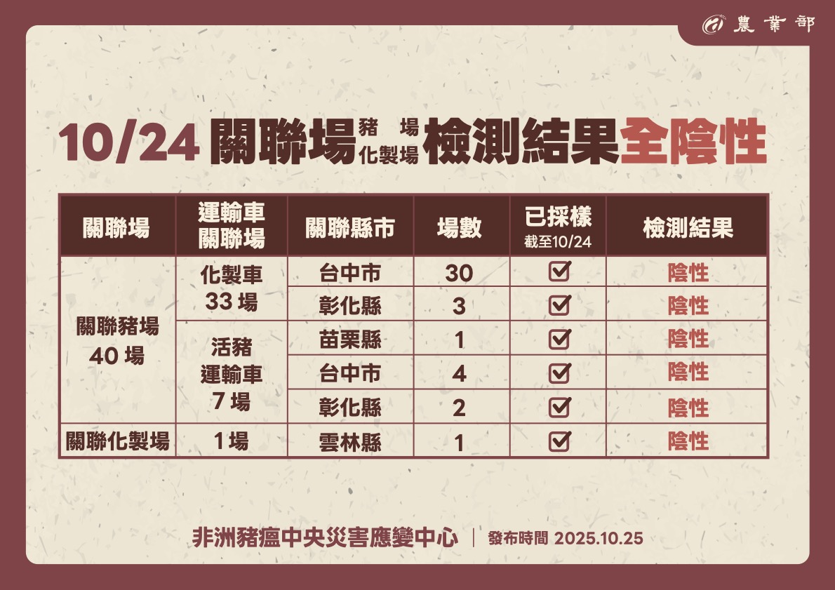 非洲豬瘟中央前進應變所已於10月25日上午公布最新疫情檢測結果,針對台中梧棲確診案例場的關聯牧場共40場(不含案例場),經臺中市動物保護防疫處完成健康訪視並送樣檢驗,經中興大學實驗室確認,全數檢測結果皆為陰性,且豬隻健康狀況均良好。防檢署指出,目前全台除梧棲案例場外,其他縣市均未發現疫情。