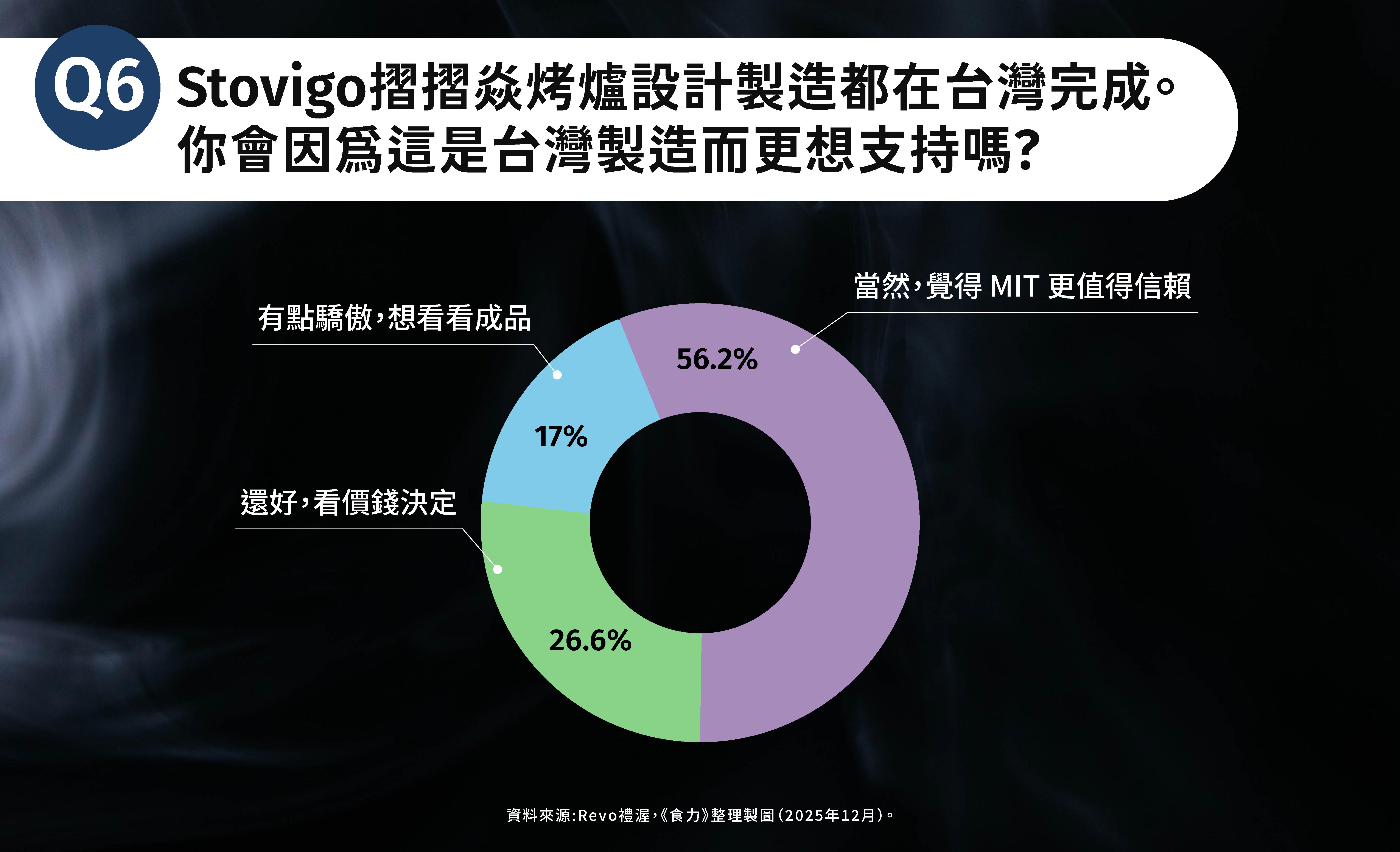 此外,可同步燒烤多樣東西的雙向熱能設計、全不鏽鋼爐身、品質安全有保障等優點,也都獲得將近5成受訪者的支持。全爐台灣製造MIT的硬底子,更讓55.9%受訪者表示更有信心想支持,另有16.7%的受訪者為台灣技術而感到驕傲。