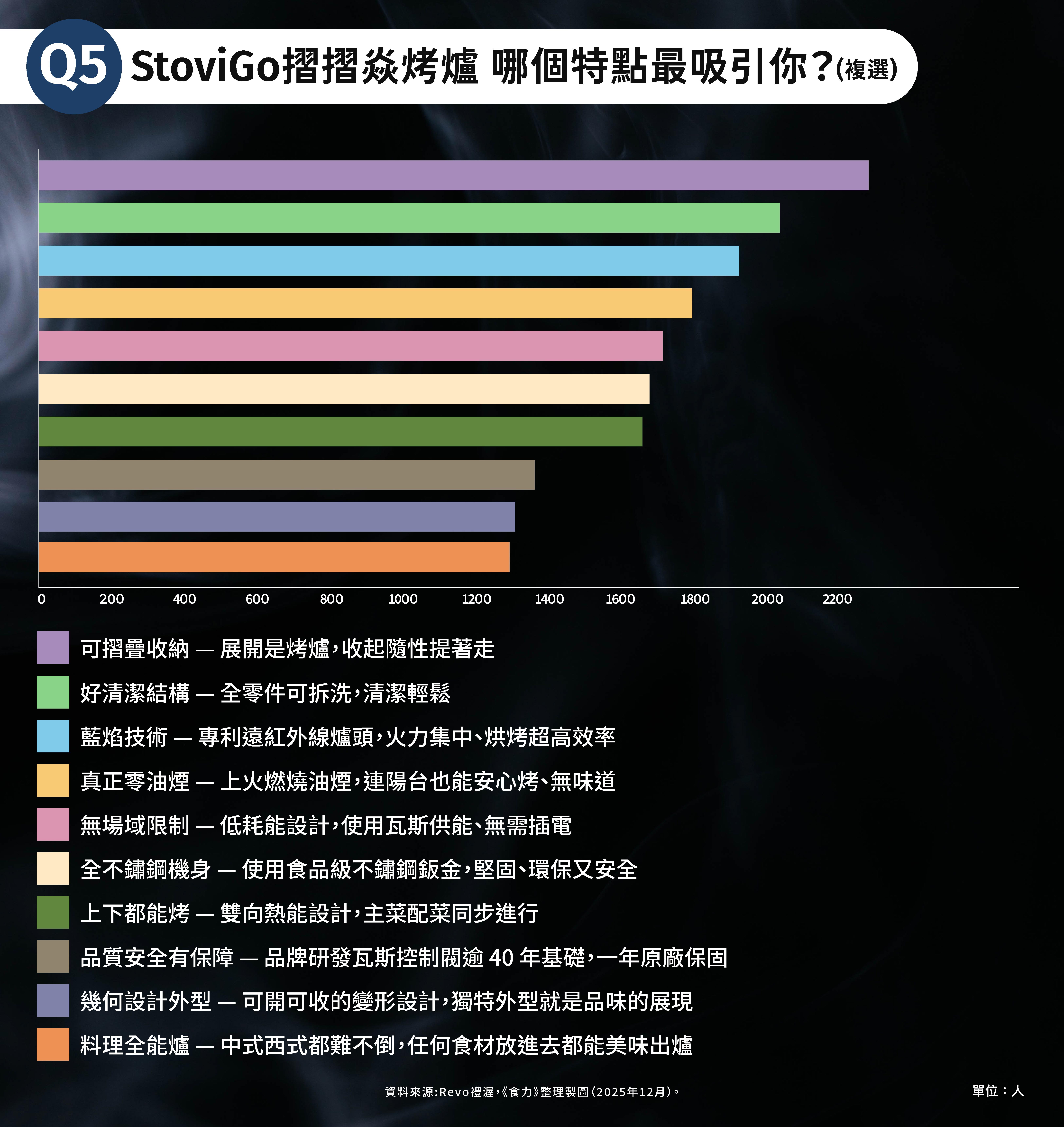 許多在烤肉時讓人感到困擾的問題,StoviGo摺摺焱烤爐都成功聰明解決:「真正零油煙-上火燃燒油煙,連陽台都能安心烤、無味道」(64.2%);「無場域限制-低耗能設計使用瓦斯功能、無需插電」(61.7%),超過6成的受訪者因為這兩項特色而對產品深感興趣。