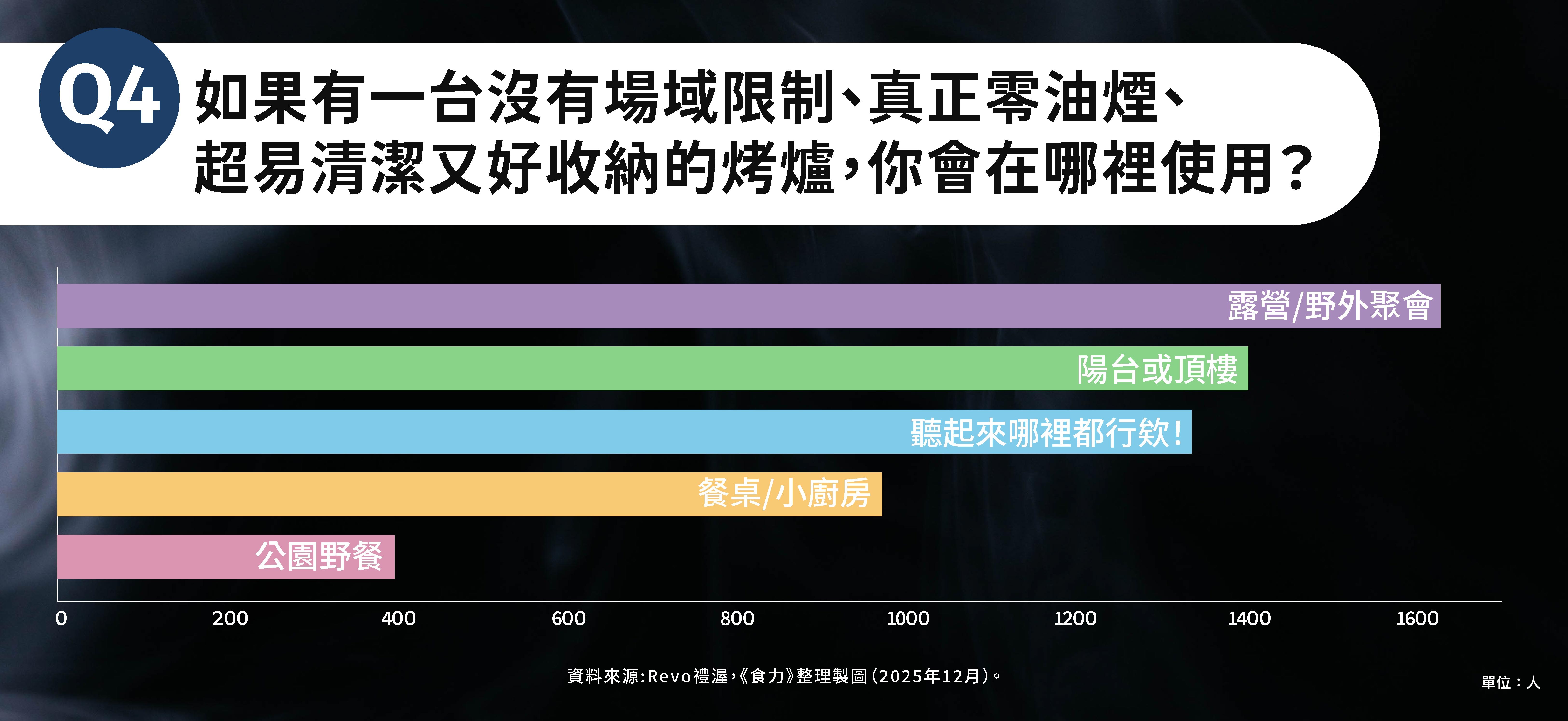 受限於場域、油煙味、清潔不便難收納等原因,讓人無法在日常生活中好好享受烤肉的樂趣。如果有一台烤爐能克服這些問題,沒有場域限制、真正零油煙、超易清潔好收納,能夠烤肉的機會與空間就變多了!將近半數的受訪者認為,有這樣的烤爐,到哪都能實現烤肉的心願(49.1%),更可以在餐桌、小廚房充分享受烤肉的樂趣(35.6%),露營或野外聚會(57.6%)、陽台或頂樓(51.2%)的烤肉當然也更加方便囉!