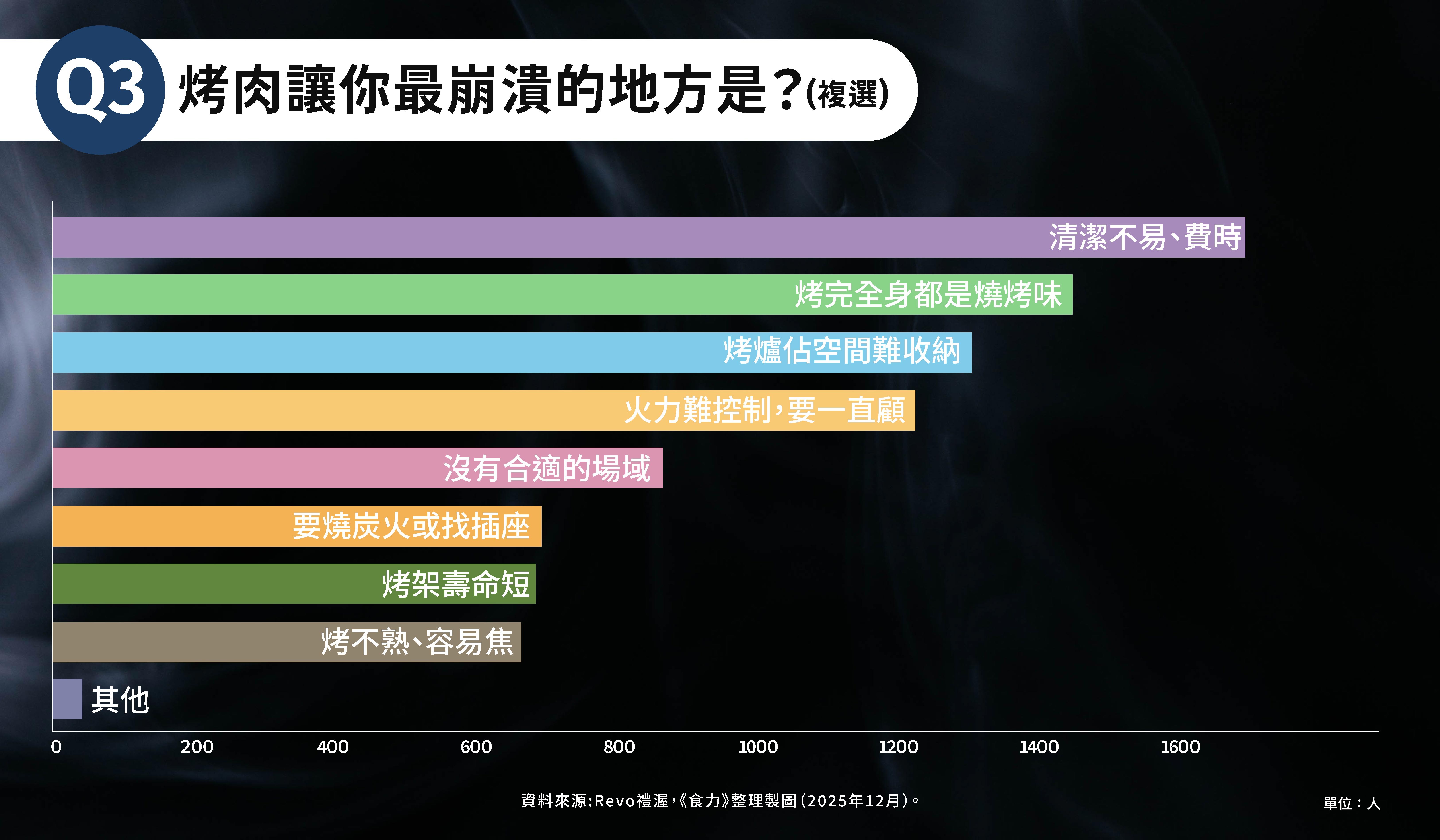 大家覺得烤肉最讓人崩潰的前五大原因,是「清潔不易、費時」(61.7%)、「烤完全身都是燒烤味」(52%),兩者皆有過半受訪者為此感到困擾。另外「烤爐佔空間難收納」(47.3%)、「火力難控制要一直顧」(44.2%)、「沒有適合的場域」(31.7%)也是最讓人煩惱的項目。