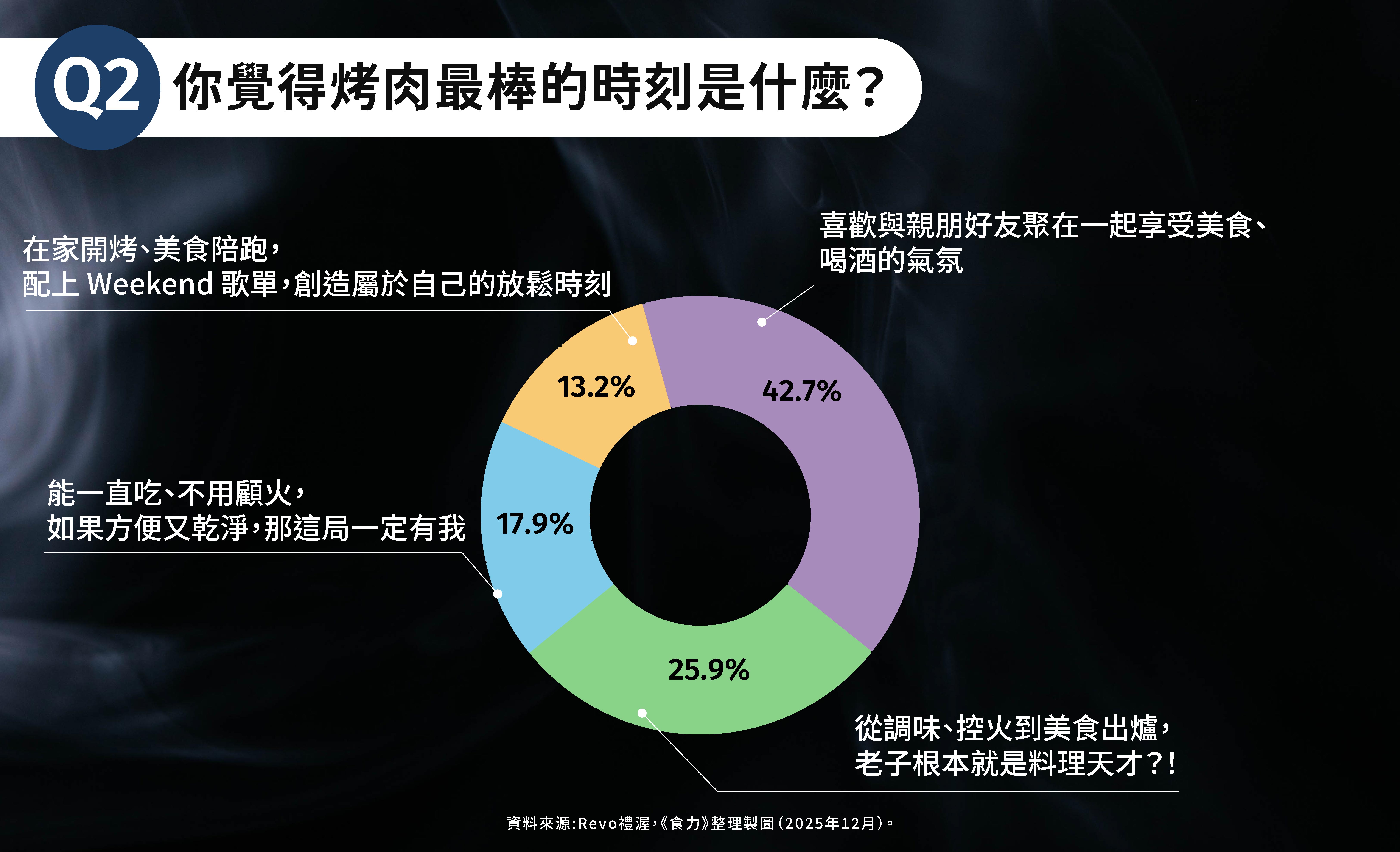 至於烤肉最棒的時刻,有42.7%受訪者認為是「與親朋好友聚在一起享受美食、喝酒的氣氛」,其次則是享受烹調樂趣「從調味、控火到美食出爐,我根本就是料理天才!」(25.9%)。