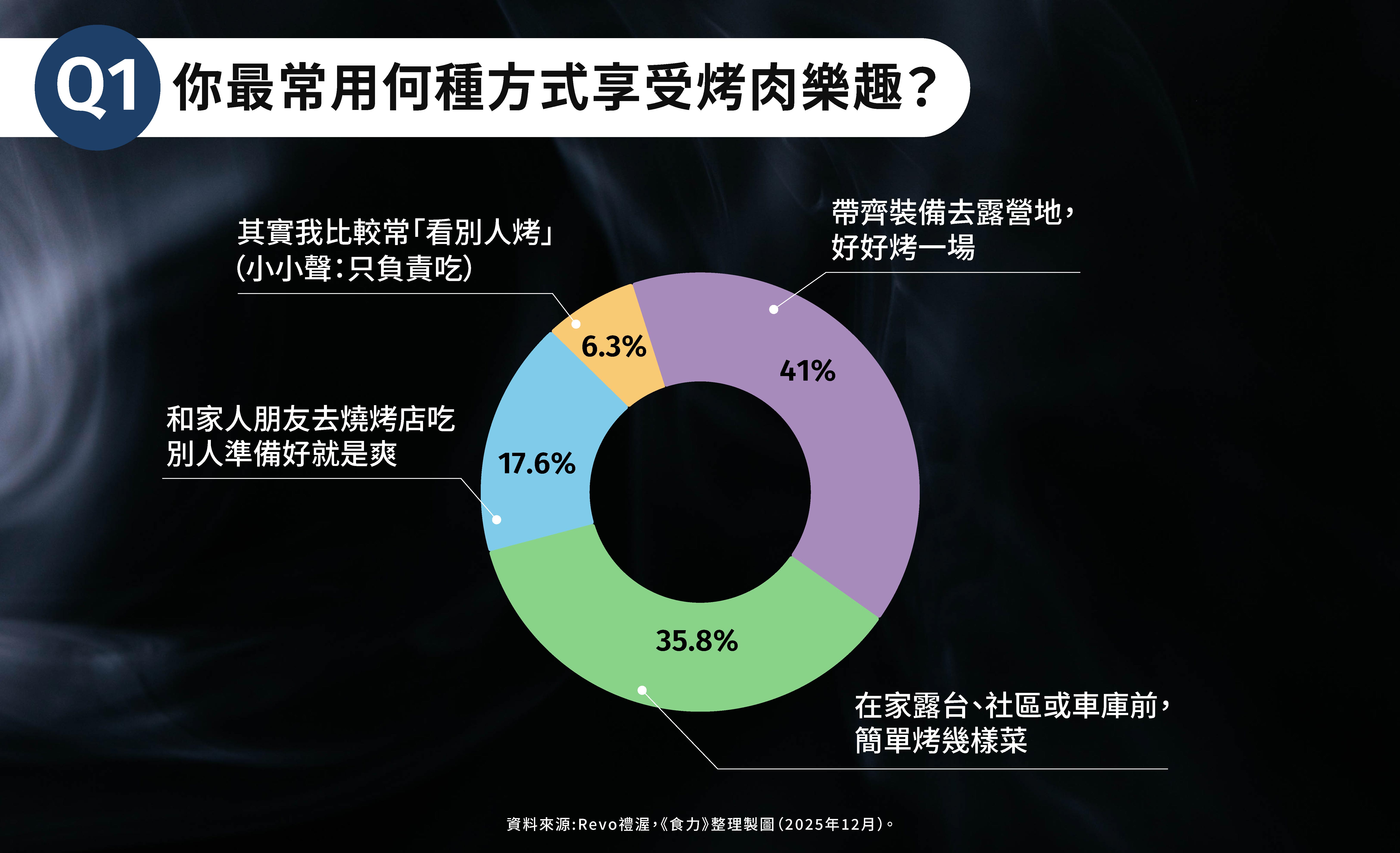最常見的烤肉方式,野營派以些微差距居冠,41%受訪者表示「帶齊裝備去營地,好好烤一烤」,居家派則緊追在後,「在家露台、社區或車庫前,簡單烤幾樣菜」(35.8%)。另外,17.6%受訪者喜歡在燒烤店享用,6.3%則偏好看別人烤、自己只負責吃的輕鬆派。
