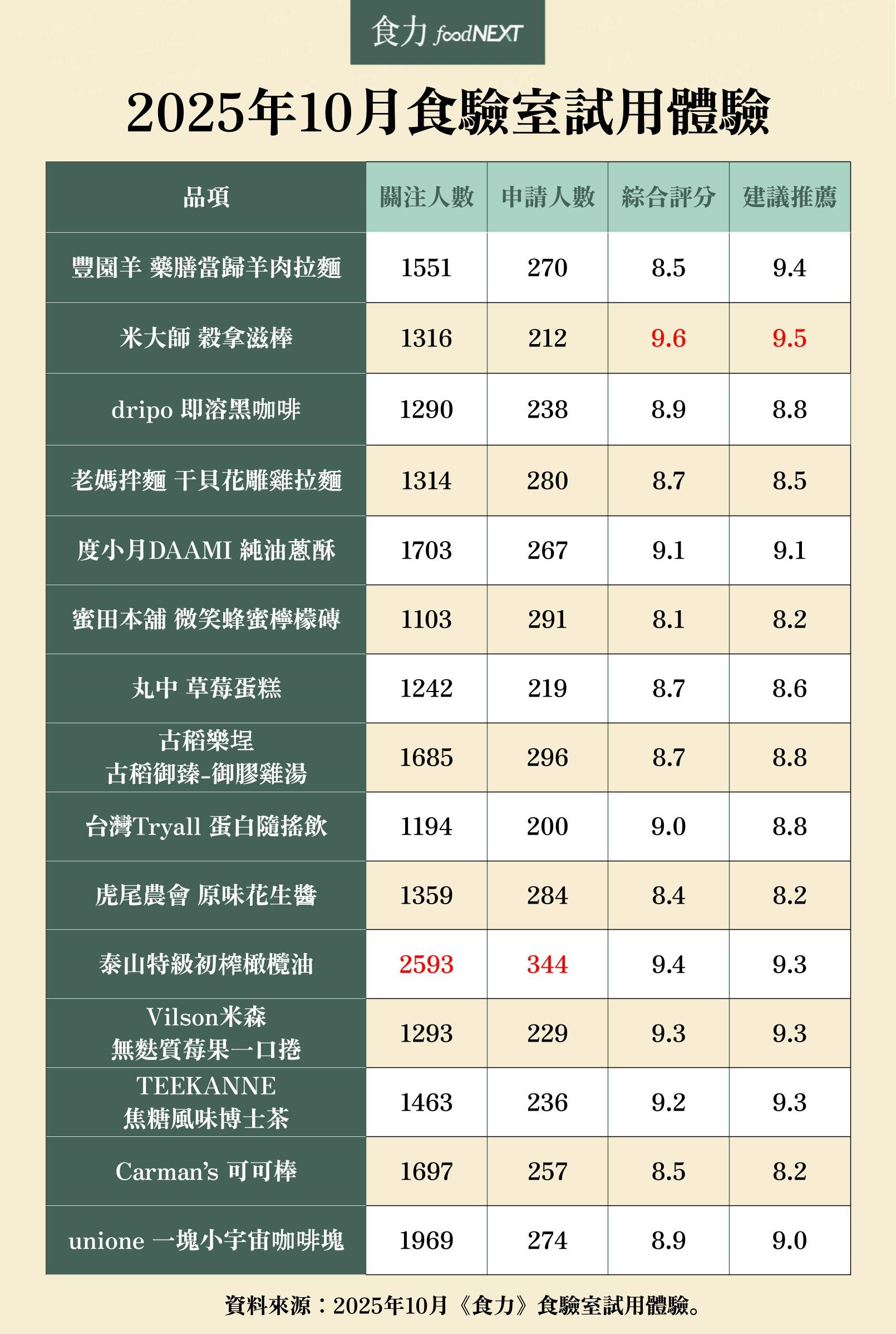 全台最大免費試吃平台「食驗室」,2025年10月提供15檔免費試吃檔期,共吸引超過2.2萬人次關注,近4千名《食力》會員申請免費試吃體驗,試吃品包含拉麵、餅乾、蛋糕和調味料等。你心動了嗎?趕快免費加入《食力》會員,眾多新品等你來品嚐!