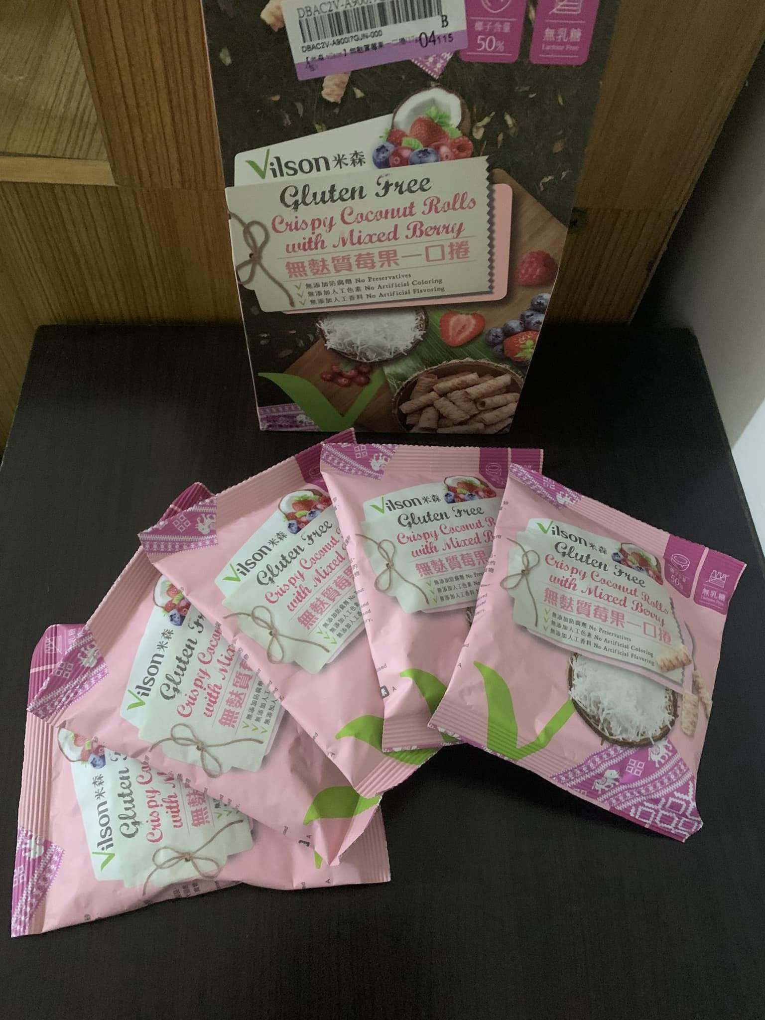 Vilson米森 無麩質莓果一口捲,舌尖上的輕盈美味提案。專業無麩質,乳糖不耐症也能輕鬆享用,香氣濃郁足量椰子,搭配真實綜合莓果粉,輕鬆補足元氣。台中市邱小姐這次體驗產品,外盒和內包裝都非常有質感又漂亮,拆封瞬間椰子的香氣撲鼻,淡淡的莓果氣味酸酸甜甜,吃起來也很酥脆不甜膩,小包裝超級剛好吃了感覺也不會罪惡!