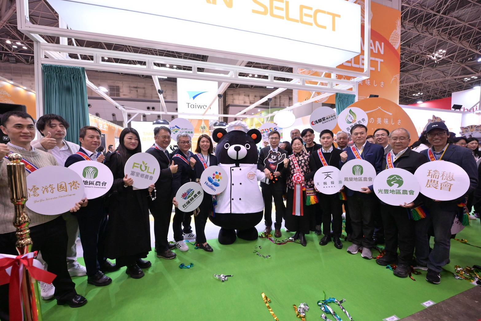 花蓮縣政府、農會代表與參展團隊於東京國際食品展花蓮館合影,象徵地方農會體系整合產地力量,以團隊形式推動花蓮農產品進軍國際市場。(圖片來源:花蓮縣農會提供)