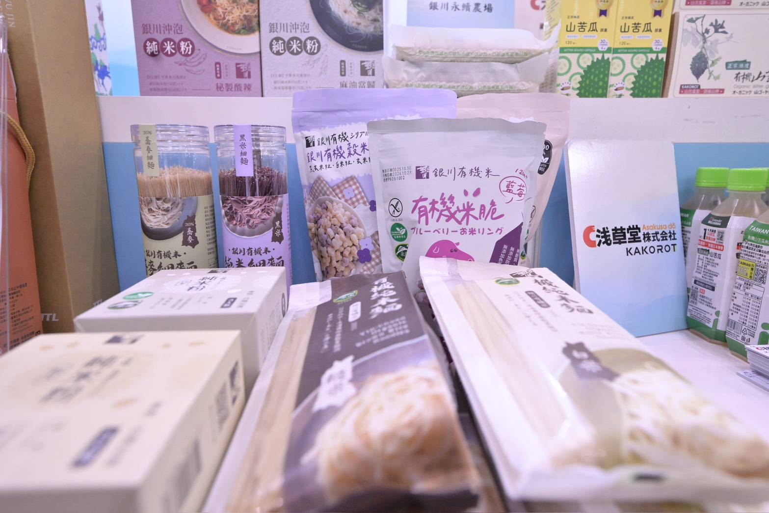 花蓮農產加工產品於展會現場展示,包括有機米製品、米餅與特色農產加工食品,呈現花蓮農業從初級農產延伸至加工產品的發展方向,提升產品附加價值與國際市場競爭力。(圖片來源:花蓮縣農會提供)