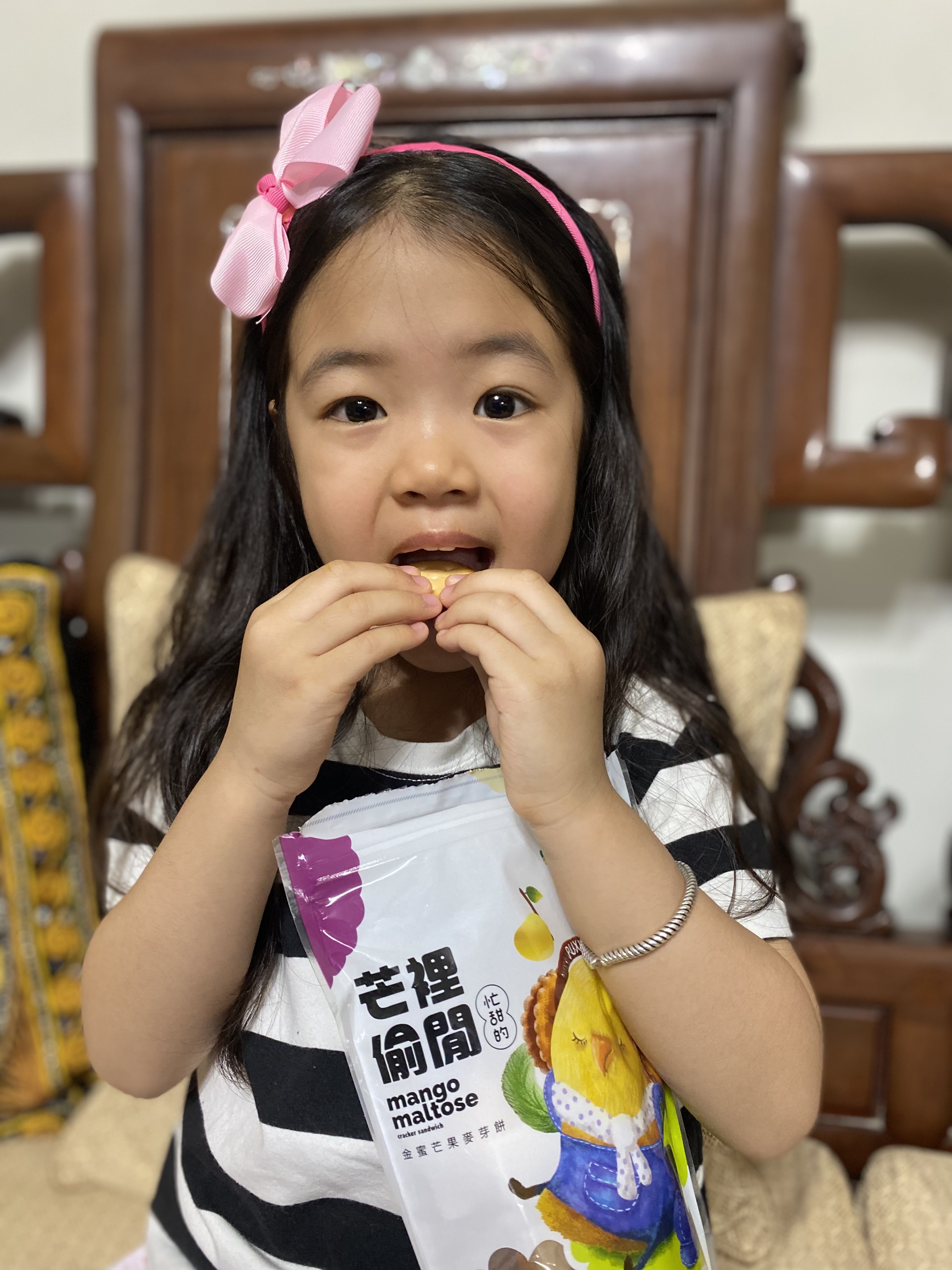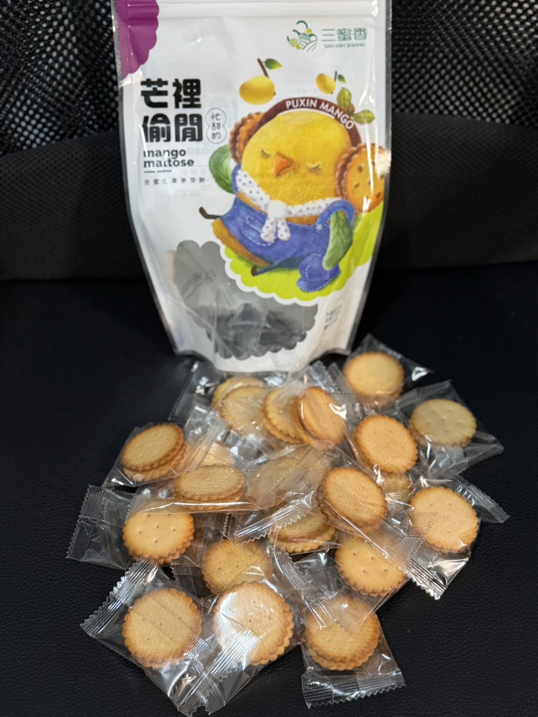 高雄陳小姐表示,外包裝童趣可愛,內容物獨立包裝更好保存,金蜜芒果麥芽餅越嚼越香,可以搭配茶水更無負擔。(圖片來源:金蜜芒果麥芽餅試吃體驗)