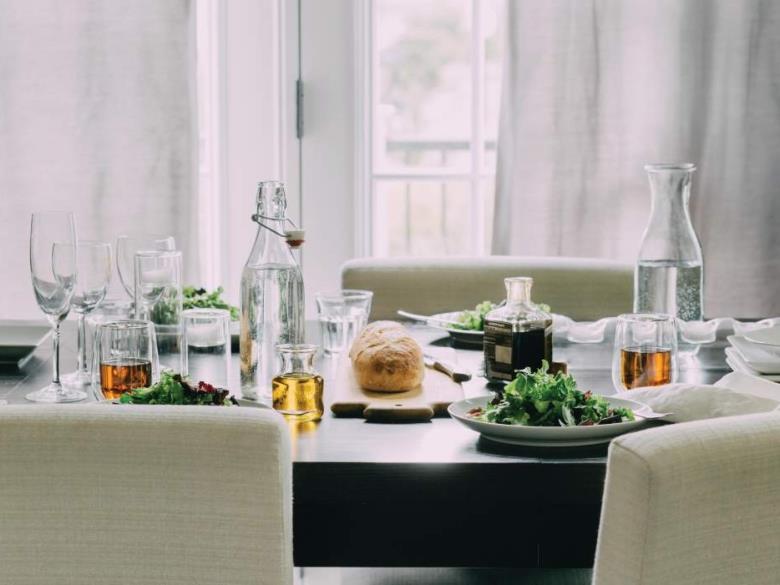 拍餐桌照圖3時,我把拍攝距離拉遠,將椅子拉進畫面,成就了一塊前景。畫面裡的層次各有分量與順序。沙拉、麵包、橄欖油和酒的顏色醒目,不受桌上眾多高高低低的杯瓶和兩把椅子影響(前文有提,粗糙質地易受注目)。暗色餐桌的前邊無光照而暗,形成另一明暗層次。畫面裡所有的層次質感,聯手為整個場景打造了一則故事。