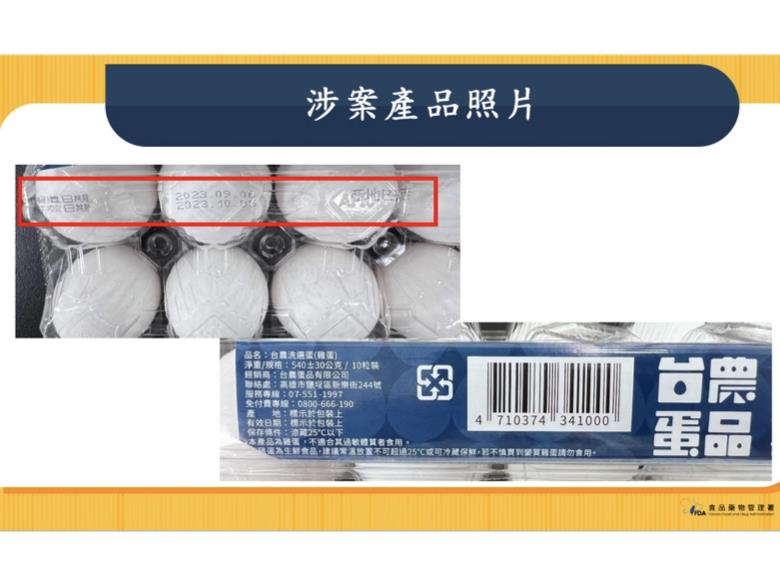 本案在食藥署會同高雄市政府衛生局及屏東縣政府衛生局於9月11日派員至台農蛋品有限公司稽查,經查該批「台農洗選蛋(雞蛋) 」產品使用之原料蛋尚在效期內(2023年9月24日),惟業者以洗選日期加1個月為有效日期(標示製造日期2023年9月6日、有效日期2023年10月5日),與提供之食品及相關產品輸入許可通知有效日期2023年9月24日資訊不相符,涉違反食品安全衛生管理法。