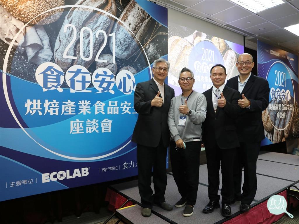 台北市糕餅商業同業公會名譽理事長高垂琮(右一)、福利麵包執行長尹玉仙(右二)以及Ecolab藝康台灣總經理李玉生(左一)於食在安心座談會中以多年產業經驗分享食品安全於現今烘焙業的重要性。