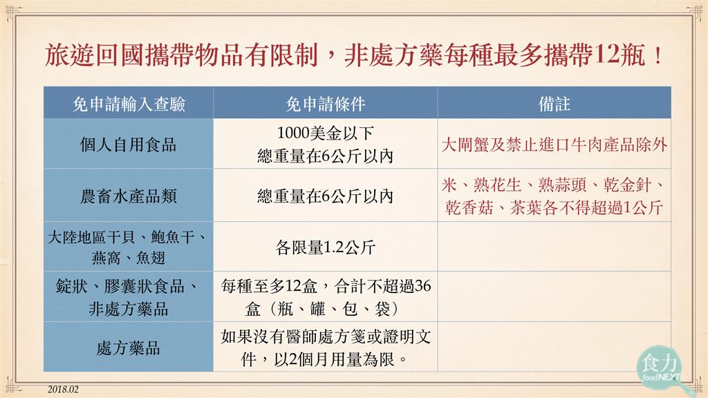 大陸地區之干貝、鮑魚干、燕窩、魚翅各限量1.2公斤,罐頭限量各6罐;不得攜帶活動物或活植物;錠狀、膠囊狀食品或非處方藥品,每種至多12盒(瓶、罐、包、袋,以原包裝為限),合計不超過36盒(瓶、罐、包、袋);處方藥品方面,如果沒有醫師處方箋或證明文件,以2個月用量為限。