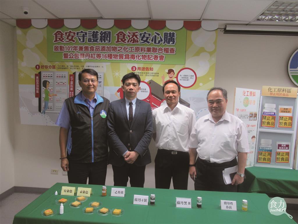 化工原料部分,行政院環境保護署(簡稱環保署)已分別於2017年9月26日及2018年6月28日公告新增玫瑰紅B、蘇丹色素等合計27種毒性化學物質。此外,於2018年3月30日公布「化工原料業及兼售食品添加物業者自主管理作業指引」,提供業者明確且易依循之化工原料管理方式,並積極宣導化學物質自主「四要管理」:貯存分區、標示明確、用途告知及流向記錄,藉由提升法規管制與業者之自主管理,降低非食品添加物之化工原料誤用或濫用與食品之風險。
