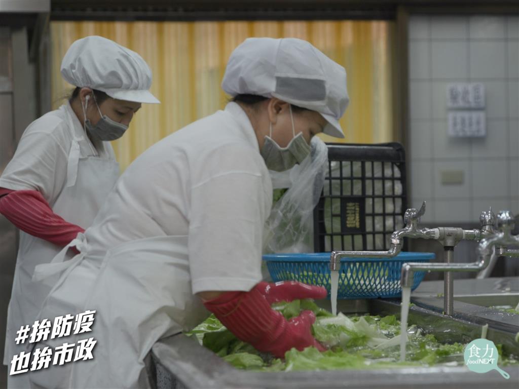 依照規定,在自立廚房的從業人員皆需通過公立醫院健康體檢,於每日入廠工作前會先量體溫、換著全白衣褲網帽,確實做好清潔消毒後才能進入廚房。