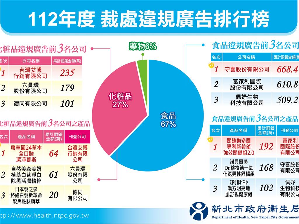 新北市衛生局進一步說明,統計違規食品廣告累計罰鍰前3名,第一名為守喜股份有限公司,罰鍰累計共668萬4000元,又以其中「諾貝爾獎Dr.穆拉德一氧化氮男性舒暢組」產品廣告誆稱「杜絕膀胱結石、睪丸回春」等非食品所能達成功效,遭重罰168萬元;第二名為富家利國際股份有限公司,罰鍰累計共610萬8000元,其「關速樂多國專利新希望強效關鍵組2.0」產品,佯稱「30天椎間盤退化,退化性關節炎有效98%」等,強調可在短時間改善骨科相關疾病,遭裁罰192萬元;第三名為佩妤生物科技有限公司,罰鍰累計共509萬2000元,其「《阿桐伯》漢方明亮地凰舒視健康組」產品宣稱「視網膜撕裂修護91%、視網膜剝離修護96%」等,影射該產品如同藥物可改善人體眼疾,遭裁罰102萬元。