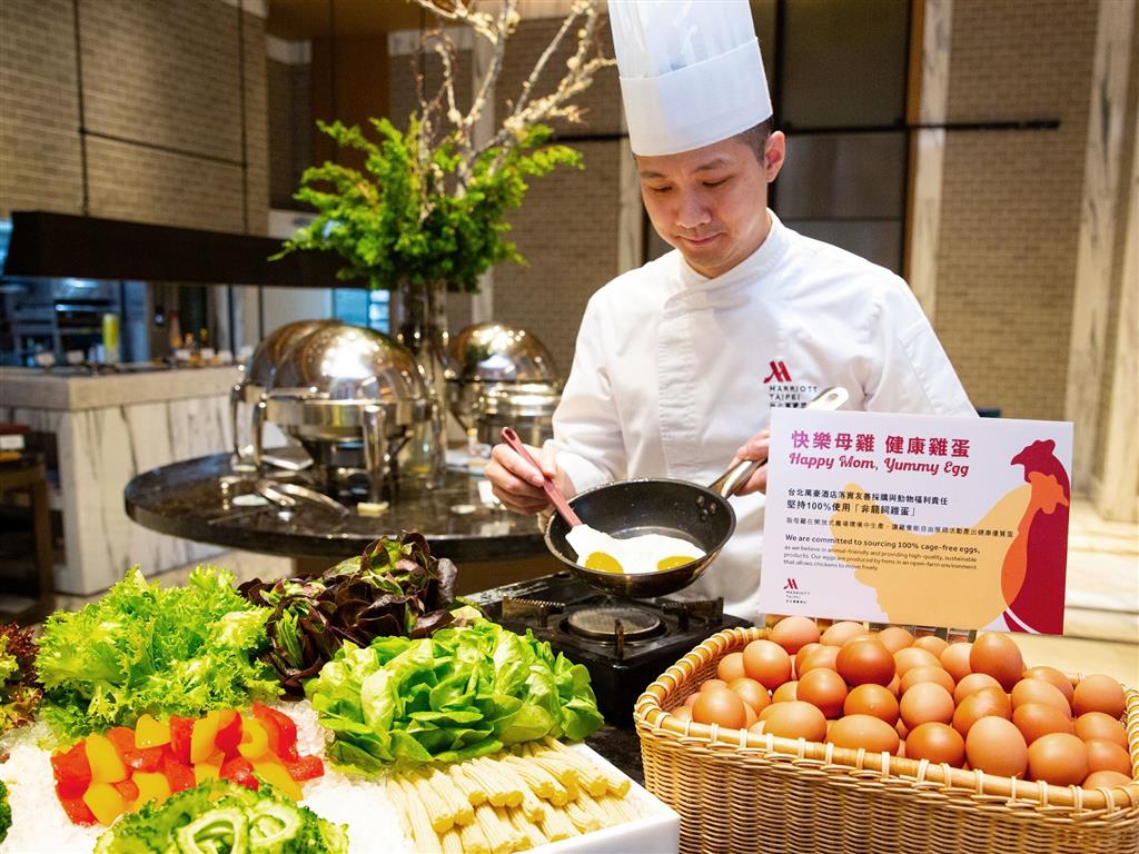 台北萬豪酒店實踐企業永續發展,宣布旗下6間餐廳、宴會場域與員工餐廳及烘培坊全面使用「動物福利標章」牧場生產的非籠飼雞蛋及鮮奶,支持友善飼養。