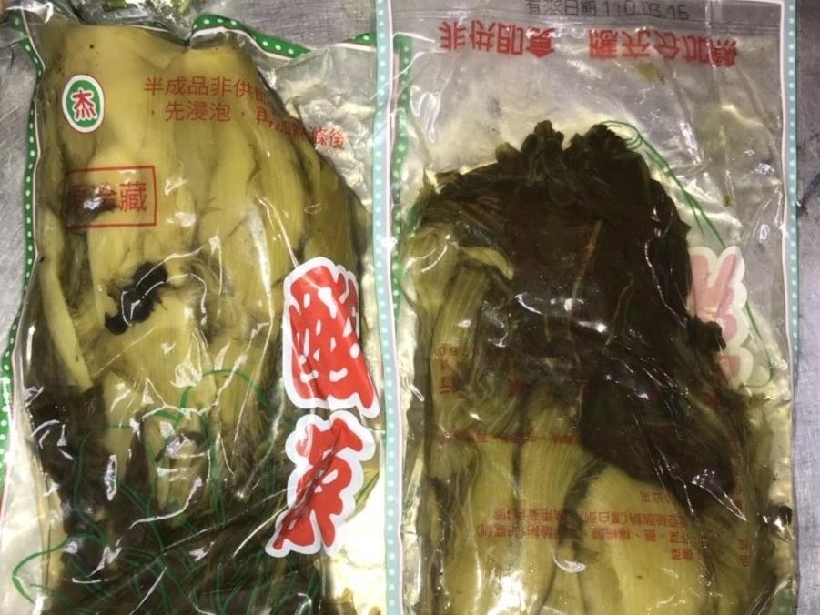 台北市第二果菜市場18-16攤葉爾旺的「酸菜葉」檢出漂白劑二氧化硫超標。(圖片來源:北市衛生局提供)