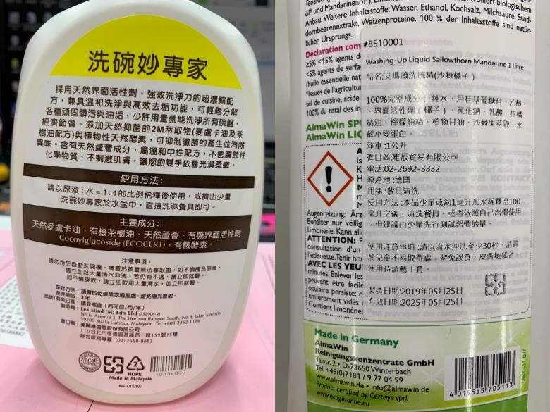 北市衛生局表示,此次同時針對19件產品外包裝標示進行檢查,經查其中1件「艾瑪薇洗碗精(沙棘橘子)」外包裝未以中文標示國內負責廠商地址,經查產品來源為新北市,已移請轄區衛生局查處;1件「綠柯美洗碗妙專家」外包裝成分僅標示「有機界面活性劑Cocolglucoside(ECOCERT)」,未以中文標示「主要成分之化學名稱」。