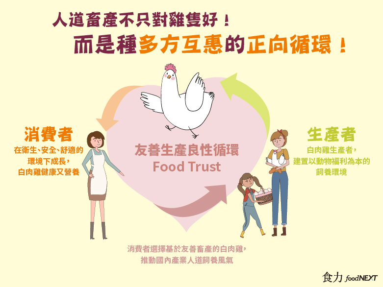 由於近年國際間對於人道飼養日益重視,而這樣的風氣也吹向國內,促使國內的禽肉飼養業者重新思考,並嘗試導入友善畜產,有些事情要做了才知道,基於動物福利的飼養方式,不僅可以改善飼養效率、降低疾病風險,進而提升整體的畜產品質。