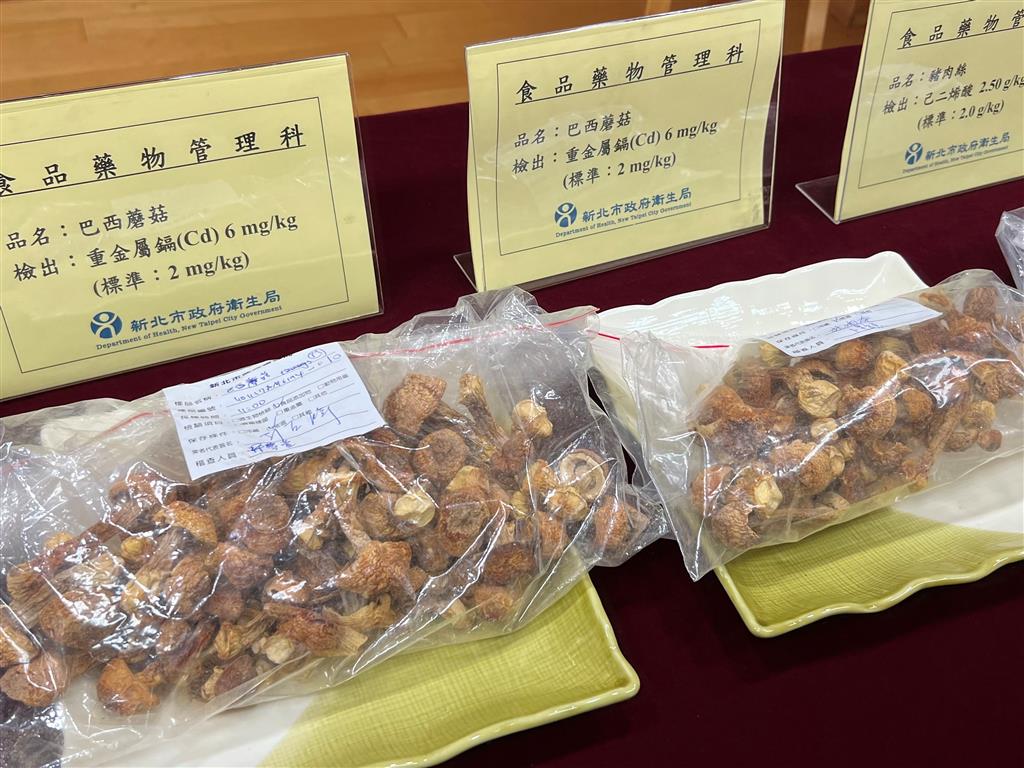 新北市衛生局指出,其中有7件違規食品包含:2件「巴西蘑菇」皆檢出重金屬鎘 6 mg/kg(2 mg/kg)及1件「竹笙」檢出重金屬鎘 6 mg/kg(2 mg/kg);另有1件「豬肉絲」檢出防腐劑己二烯酸 2.50 g/kg(2.0 g/kg)、1件「酸菜心」檢出二氧化硫0.172 g/kg(0.03 g/kg以下)、1件「筍茸」檢出防腐劑苯甲酸 1.54 g/kg(0.6 g/kg)及漂白劑二氧化硫0.560 g/kg(0.03 g/kg以下)及1件「高麗菜乾」檢出防腐劑苯甲酸 0.98 g/kg(0.6 g/kg),皆超出食品添加物使用限量標準。