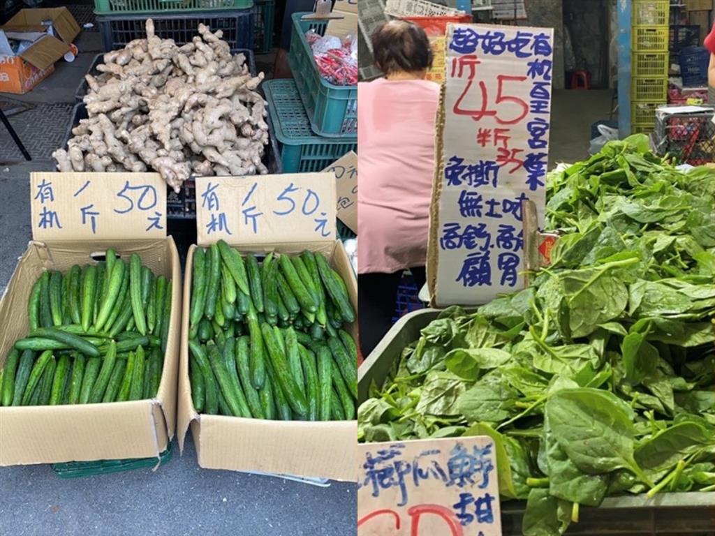 消基會在傳統市場及黃昏市場採樣12件樣品,其中在掛牌或立牌書寫「有機」或「有机」的菜攤購買的樣品共3件,皇宮菜、紅莧菜及小黃瓜各1件。(圖片來源:消基會提供)