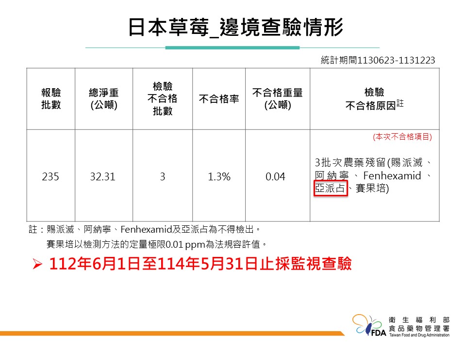 日本出口草莓檢出不得檢出之殘留農藥亞派占,食藥署持續於邊境採監視查驗