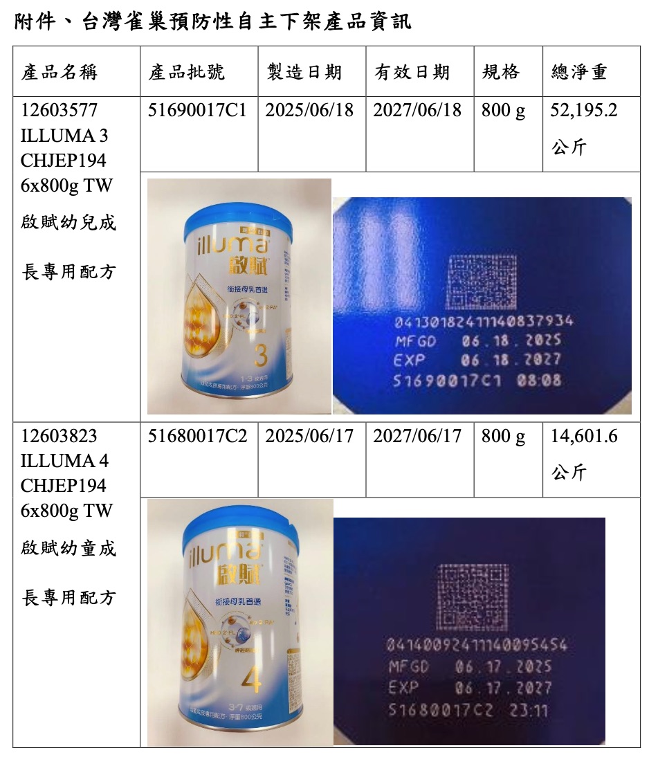 食藥署於1月8日接獲台灣雀巢自主通報後確認,下架產品為2批號「啟賦幼兒(童)成長專用配方」,分別為啟賦3與啟賦4,規格皆為800g,製造日期為2025年6月中旬,有效期限至2027年6月。台灣雀巢已同步啟動通路下架,並提供消費者退換貨服務專線0809-000-828。