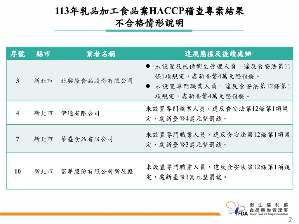 食藥署表示本次專案截至2024年11月28日止完成查核27家乳品製造業者、抽查45件產品標示、抽驗28件乳製品或原料。新北「北興隆食品股份有限公司」未設置及核備衛生管理人員;新北「北興隆食品股份有限公司」、「伊通有限公司」、「華盛食品有限公司」、「富華股份有限公司新屋廠」等4家業者未設置專門職業或技術證照人員,違反食安法第11條或第12條規定,轄管衛生局均已依同法第47條規定處辦,總計裁處新臺幣18萬元整,餘者查核及檢驗結果皆符合規定。