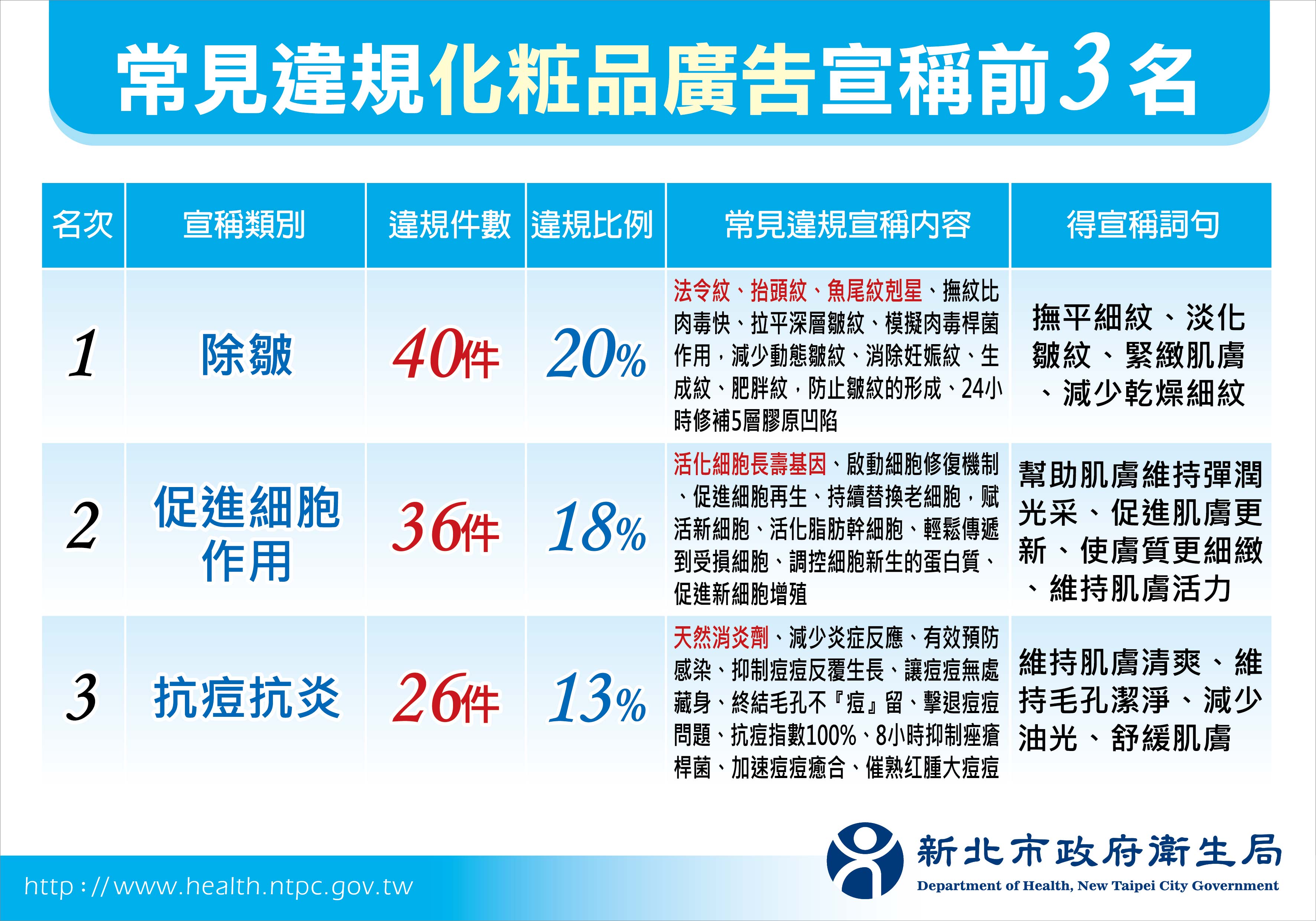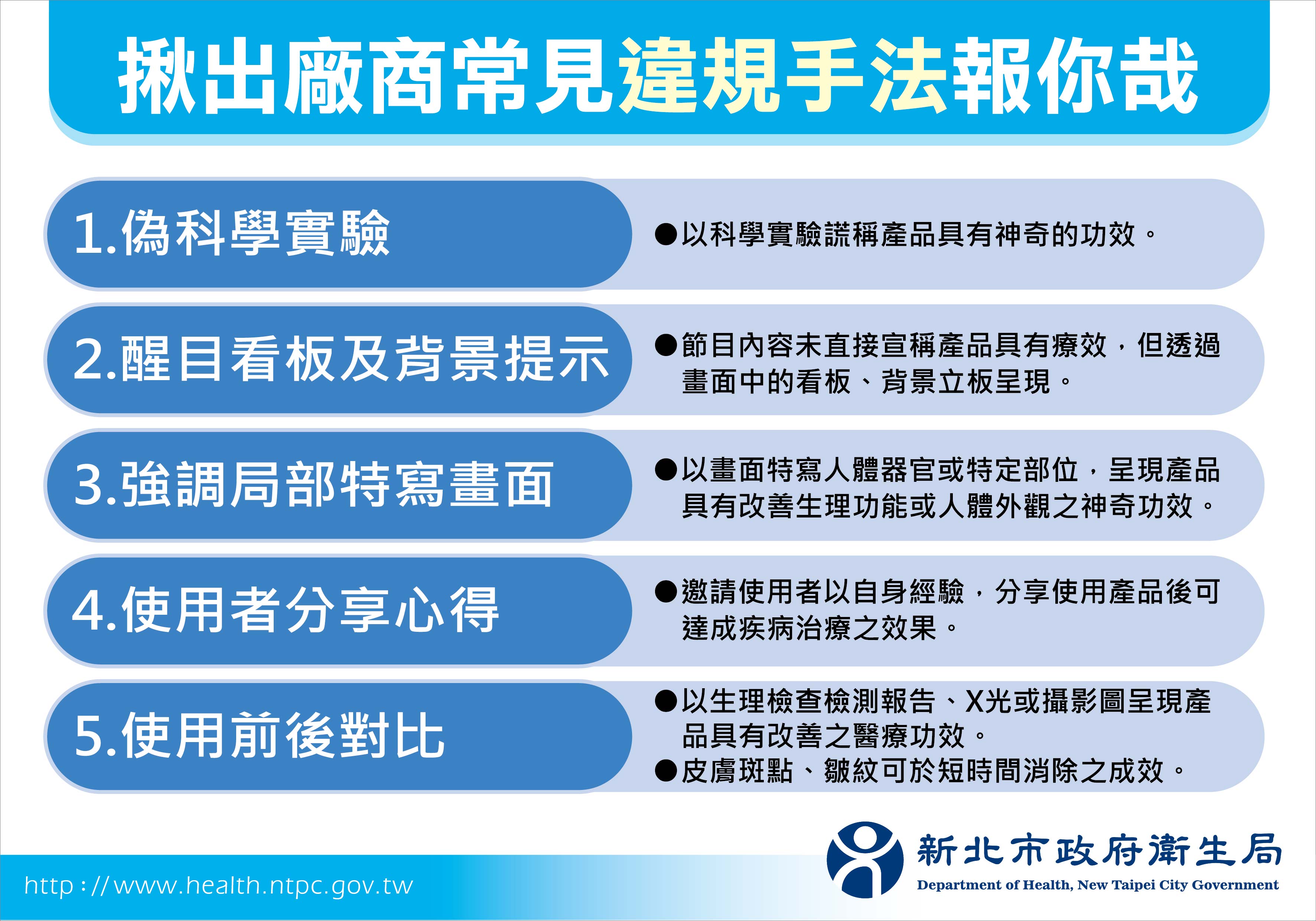 新北衛生局呼籲凡食品及化粧品皆不具醫療效能,廠商常以「偽科學實驗」或以「醒目看板及背景提示」、「強調局部特寫畫面」、「使用者分享心得」及「使用前後對比」等手法,強調短時間可改善疾病症狀或以誇張檢測數據來誘騙消費者。