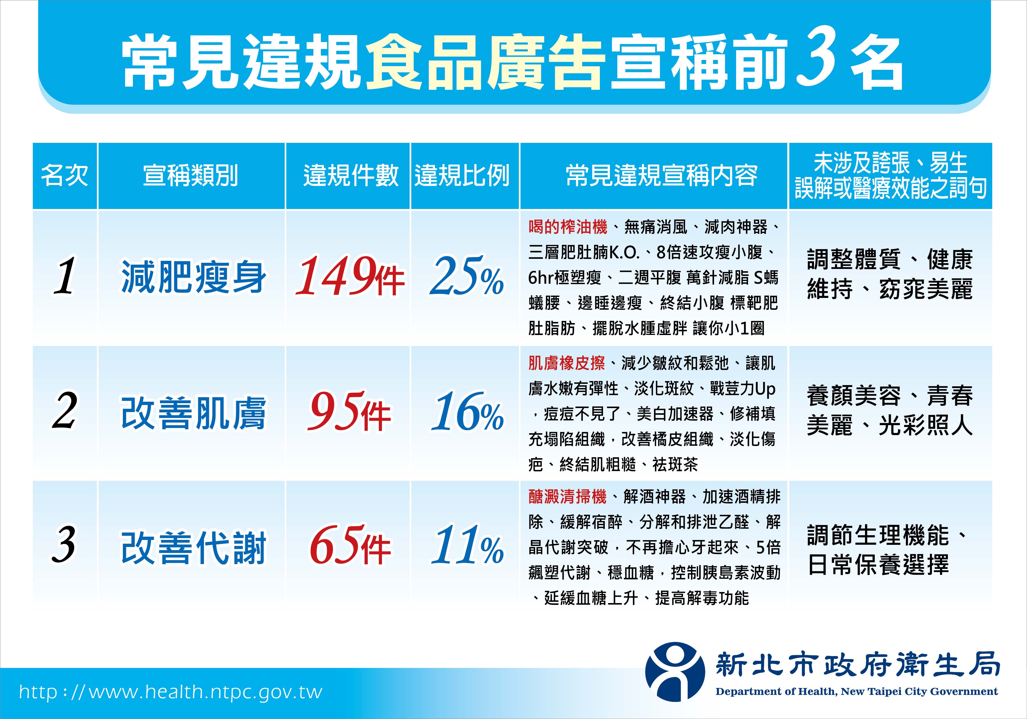 統計違規食品廣告多宣稱「減肥瘦身」、「改善肌膚」及「改善代謝」等誇大用語;化粧品廣告以宣稱「除皺」、「促進細胞作用」及「抗痘消炎」為主;藥品及醫療器材則以未具藥商資格或未經核准即刊登廣告為多,一般商品則以常見宣稱改善婦科疾病或具止痛消炎效果,易使消費者對產品功能產生誤解。