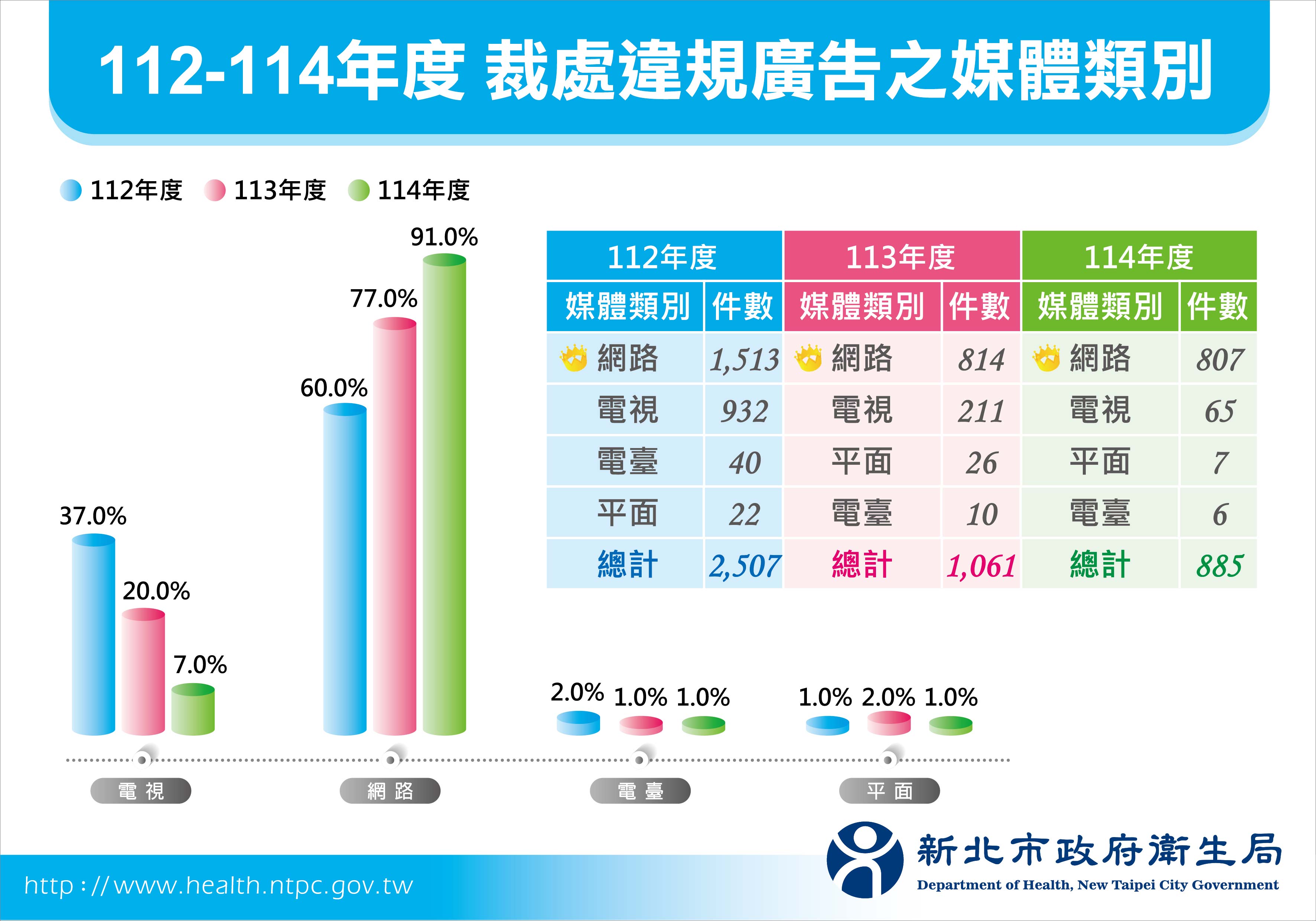 新北衛生局副局長馬景野表示,2025年裁罰轄內違規產品廣告共計885件,其中以食品類594件(67%)為最多,其次為化粧品類203件(23%),藥品及醫療器材類73件(8%),一般商品15件(2%);違規廣告刊登媒體則以網路807件(91%)為主,其次分別為電視頻道65件(7%)、平面媒體7件(1%)及電台6件(1%),顯示與網路刊登門檻低、傳播速度快,加上社群平台與通訊軟體普及,間接推升網路違規廣告比例。