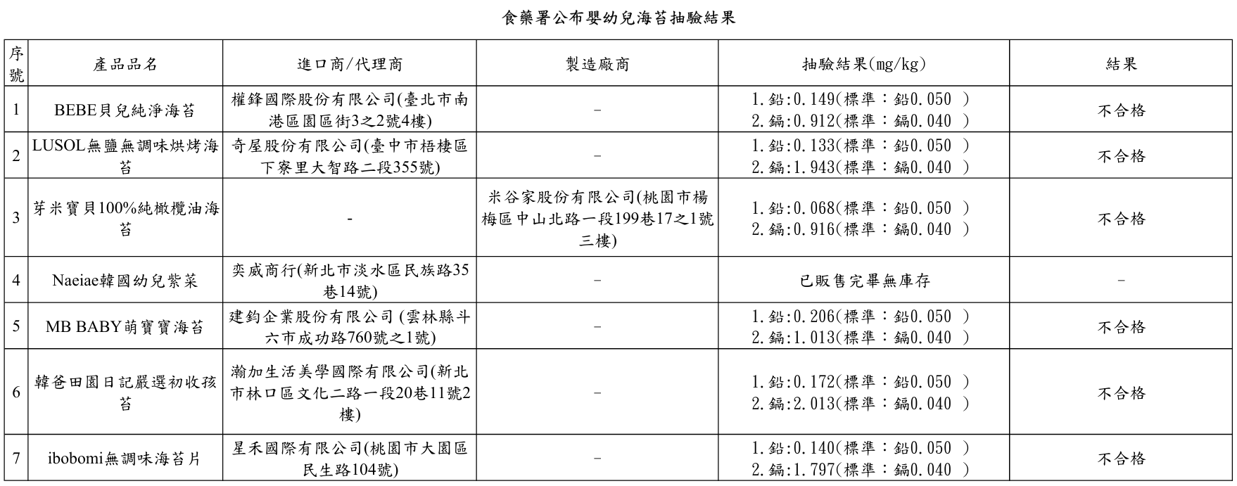 食藥署北區管理中心主任劉芳銘表示,7件嬰幼兒海苔產品中,除米谷家股份有限公司「芽米寶貝100%純橄欖油海苔」已販售完畢無庫存,其餘6件產品重金屬鉛、鎘皆不符「食品中污染物質及毒素衛生標準」中「嬰幼兒副食品類規定」,包括權鋒國際股份有限公司「BEBE貝兒純淨海苔」、奇屋股份有限公司「LUSOL無鹽無調味烘烤海苔」、奕威商行「Naeiae韓國幼兒紫菜」、建鈞企業股份有限公司「MB BABY萌寶寶海苔」、瀚加生活美學國際有限公司「韓爸田園日記嚴選初收孩苔」與星禾國際有限公司「ibobomi無調味海苔片」。針對不符規定產品已要求業者立即啟動下架回收,截至2026年1月12日,共計下架回收產品25,047件。