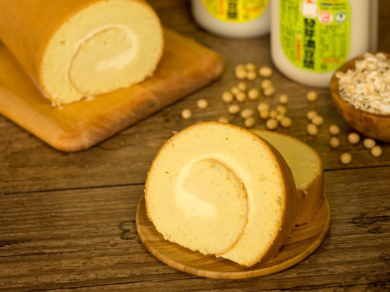 圖:「馬可先生雜糧麵包烘焙坊」推出的「芝麻燕麥豆漿蛋糕卷」,使用美國有機黃豆製作發芽濃豆漿取代水,揉入大麥燕麥營養穀物,細細研磨讓蛋糕質地更加細緻,綿密鬆軟、沒有過分甜膩,入口瞬間盡是滿滿的濃醇豆香