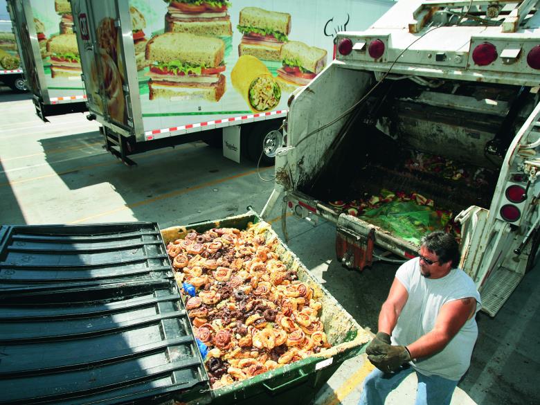 在已開發國家,家庭丟棄的食物約占購買量的三分之一。大部分的廚餘會進入當地的廢棄物處理系統,從那有一些會被回收再利用,但絕大多數會被送往垃圾掩埋 場,在那裡腐爛,並釋放出大量的溫室氣體甲烷。