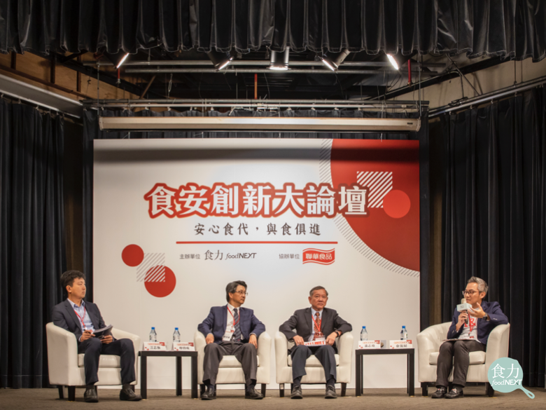 「食安創新大論壇:安心食代,與食俱進」與會者由右至左為《食力》創辦人暨總編輯童儀展、聯華食品研發部經理陳育慧、食品藥物管理署食品組組長潘志寬、食品工業發展研究所所長廖啓成、聯華食品桃園廠廠長江志強。
