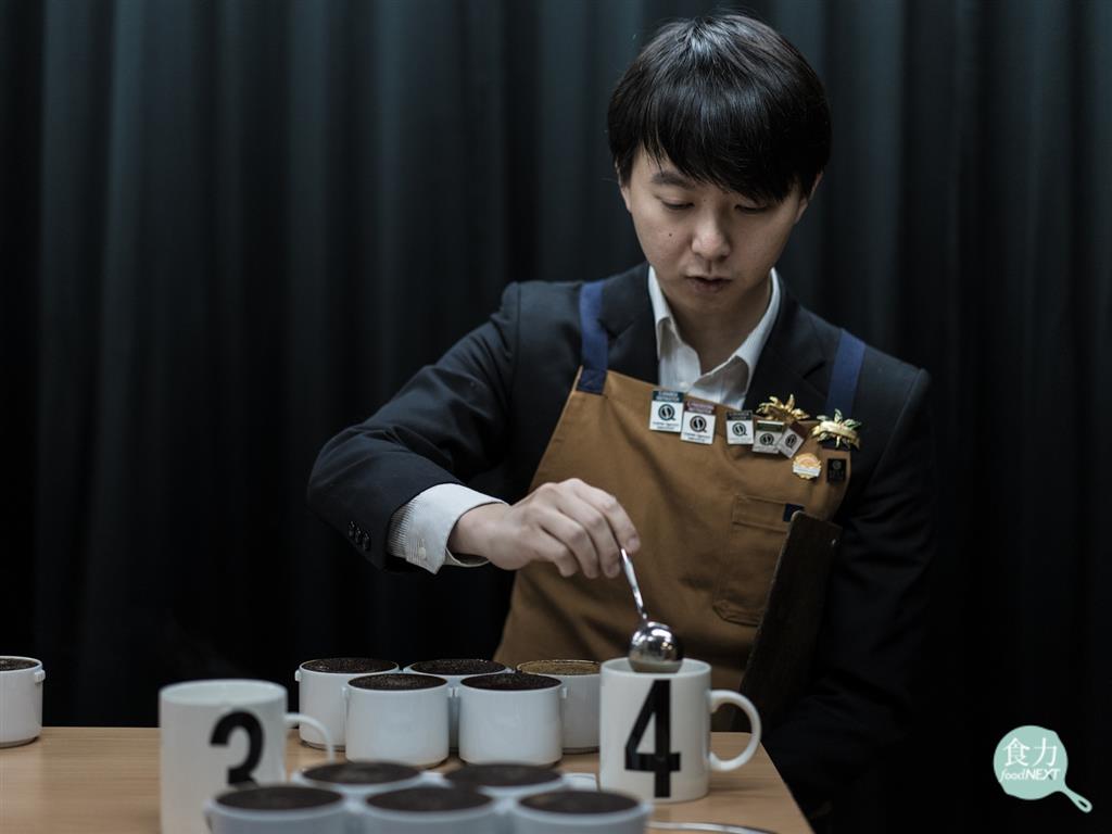 衛生杯測流程如台灣咖啡研究室計畫主持人林哲豪示範: