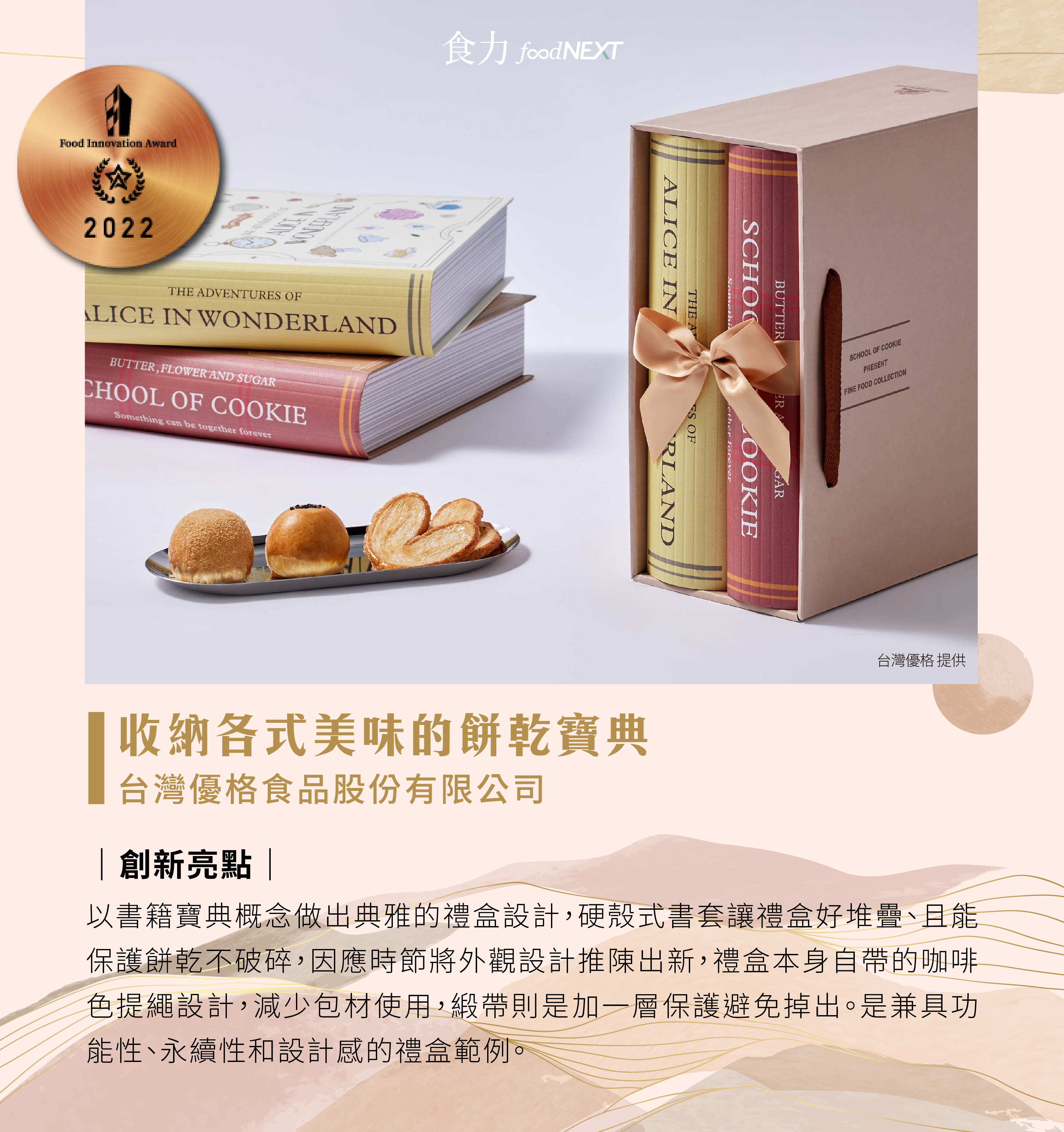 掌握基礎原則是重點,若是設計與產品脫鉤,又或是與品牌形象不夠吻合,再華美的外表、內容還是空洞的。而從2022食創獎的二星和三星獲獎產品上,可見在符合符合基本元素後,又有不同的創新挑戰,提升產品吸睛度、議題感和價值感。