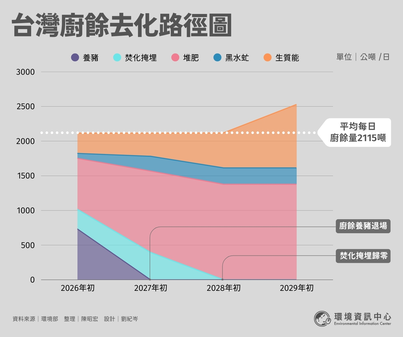 我國政府宣布2027年起全面禁止廚餘養豬,2026年開放一年事業廚餘作為過渡措施。環境部規劃三年內擴充堆肥、生質能與黑水虻等廚餘去化量能,預計2028年全面到位並逐步終結焚化與掩埋。然而,量能不足、處理成本攀升及民眾分類習慣未改,仍可能使廚餘持續進入焚化體系。