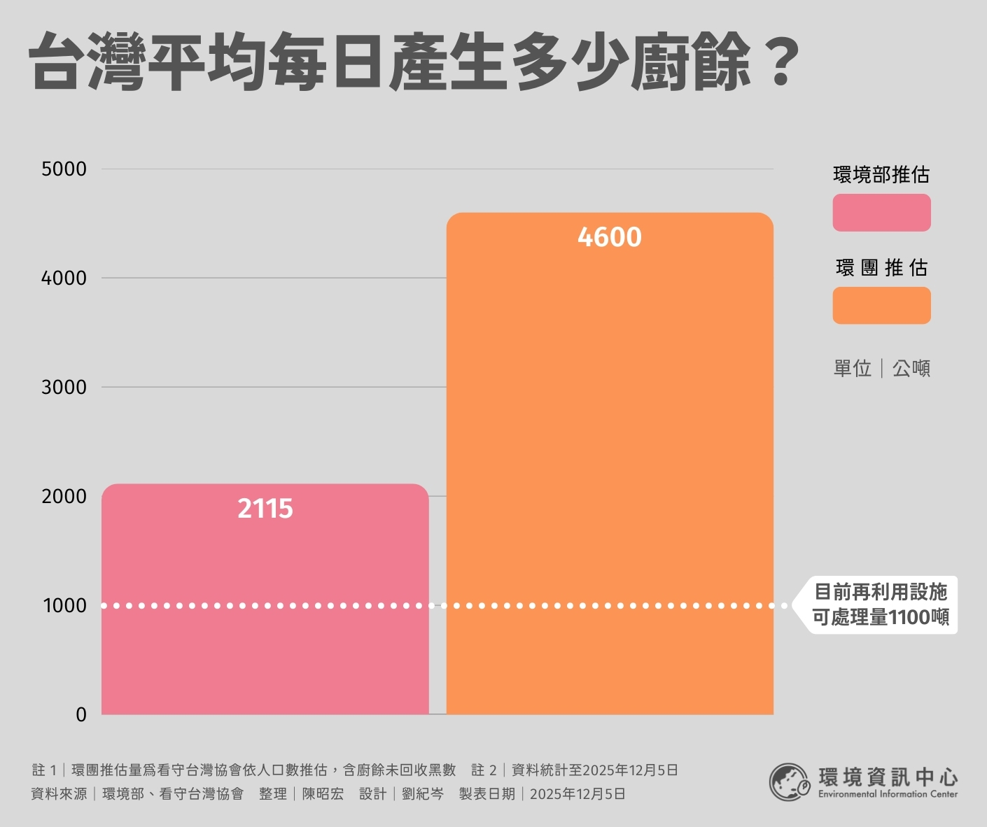 不過,謝和霖指出,看守台灣協會以台北市垃圾採樣分析資料,每人每日廚餘產生量0.2公斤計算,推估全台約2300萬人每日產生4600噸廚餘,並非環境部推估的每日平均2115噸。即便是目前路徑圖中的2029年再利用設施量能,也不夠處理。